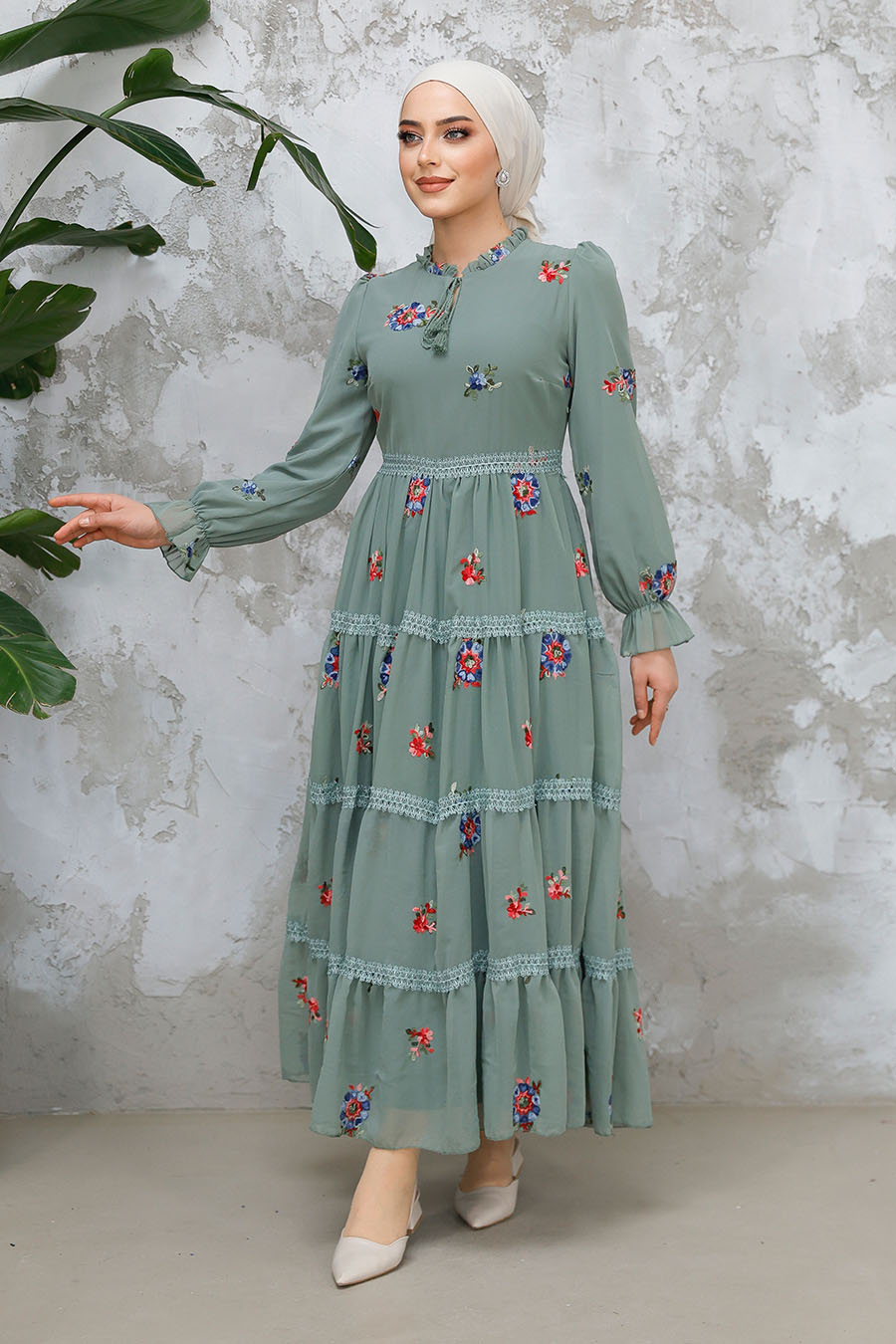مميزات القماش: مصنوع من 80% بوليستر، 20% قطن. مميزات المنتج: ياقة واقفة، ياقة برباط، أكمام طويلة، مطاط عند نهاية الأكمام، نمط زهور، مطوي ومبطن. طول المنتج: 140 سم. لون المنتج: أخضر – نمط الحياة. قد يكون هناك اختلاف في لون المنتج بسبب التصوير. يباع كفستان فقط حجم العينة: 38 الغسيل: يمكن غسله على درجة حرارة 30 درجة دون عصر قياسات العارضة: الارتفاع: 170 سم الخصر: 72 سم الأرداف: 98 سم الصدر: 90 سم الوزن: 60.