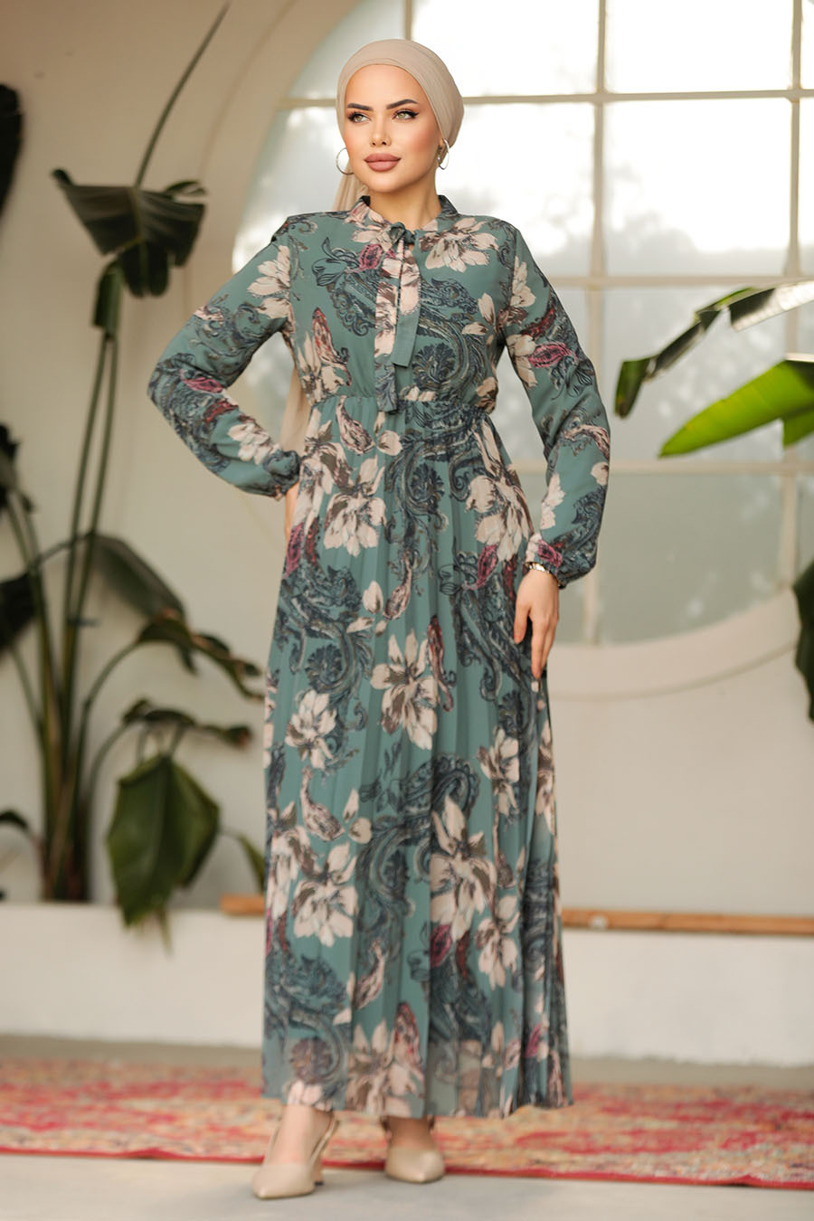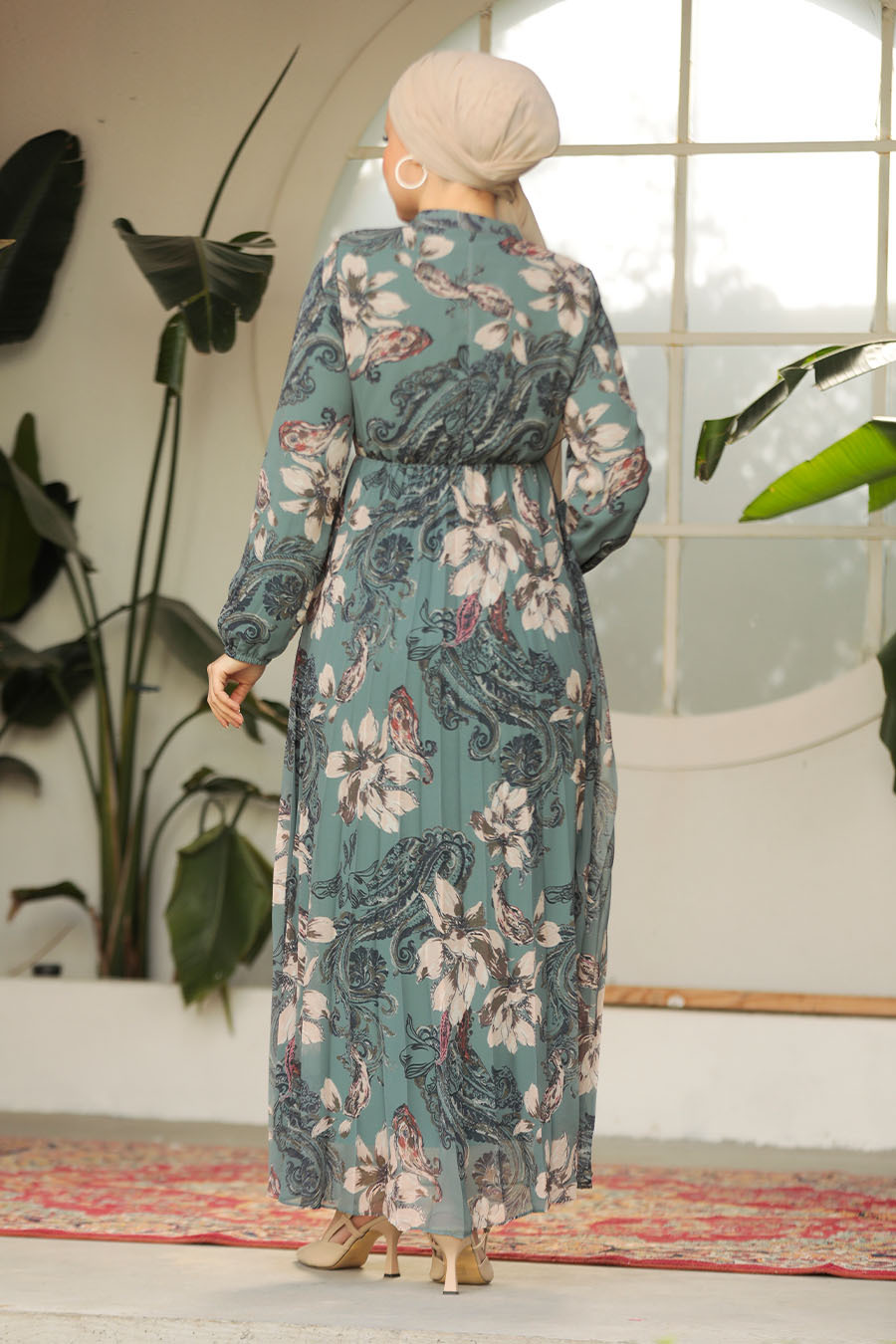 فستان حجاب أخضر منقوش بالزهور 50355cy