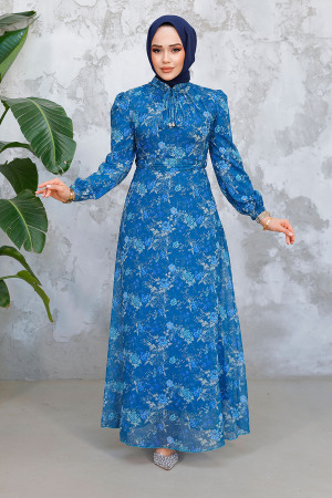 فستان حجاب أزرق بترولي منقوش بالزهور 50812pm
