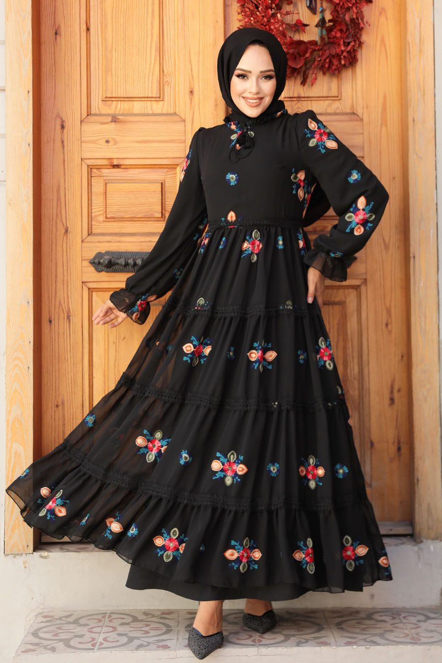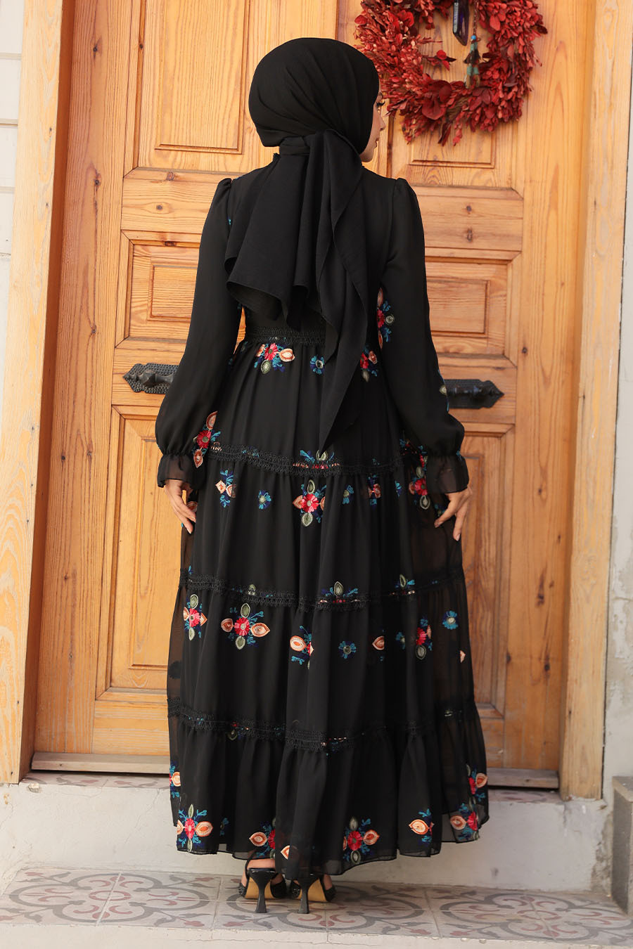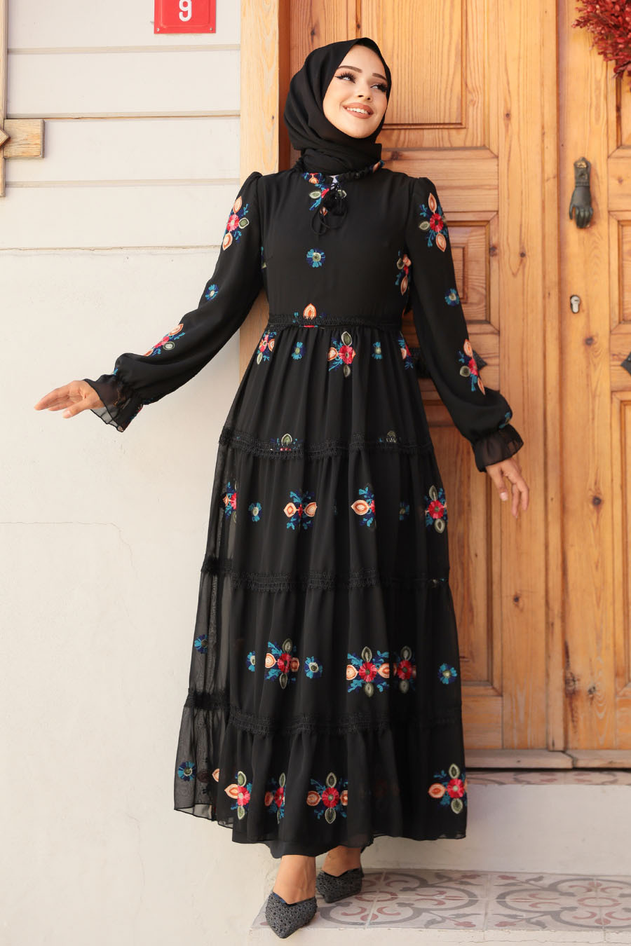 فستان حجاب أسود منقوش بالتطريز 45541s