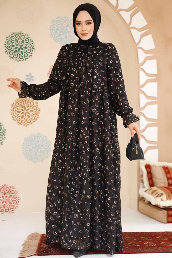 فستان شيفون حجاب أسود منقوش 23602s