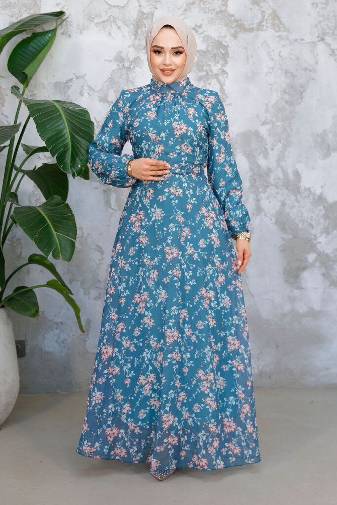 فستان حجاب أخضر منقوش بالزهور 52682cy