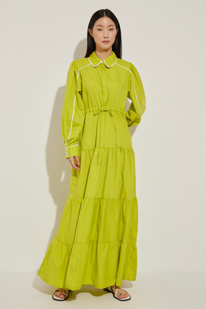 فستان بوبلين أخضر فستقي مع تفاصيل الأنابيب