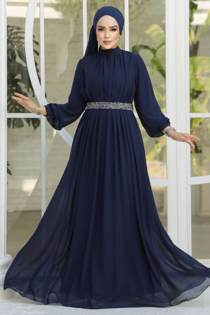 فستان سهرة حجاب – فستان سهرة حجاب أزرق داكن مطوي 25888l