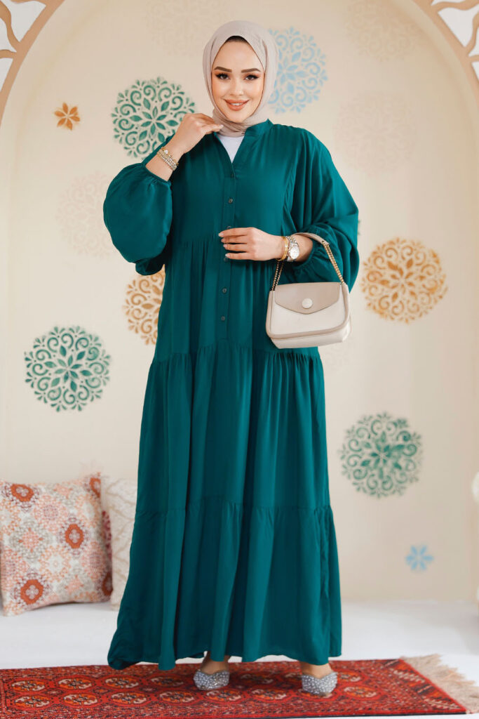 فستان حجاب أخضر زمردي بطيات بطبقات 20612zy