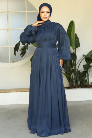 فستان سهرة حجاب – فستان سهرة حجاب أزرق داكن مطوي 25890l