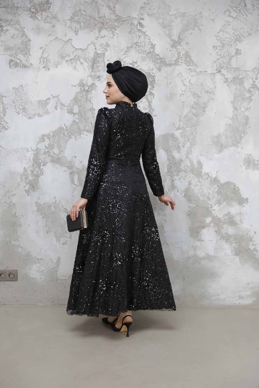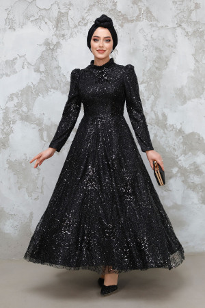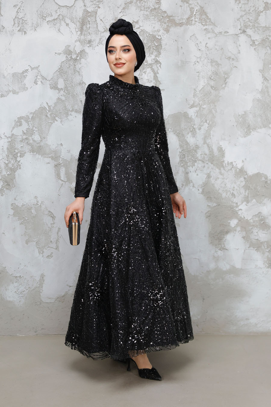فستان سهرة حجاب – فستان سهرة حجاب أسود مطرز 50461s
