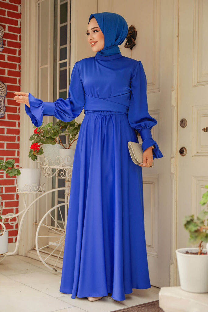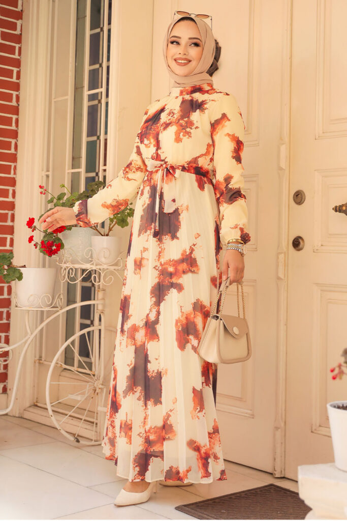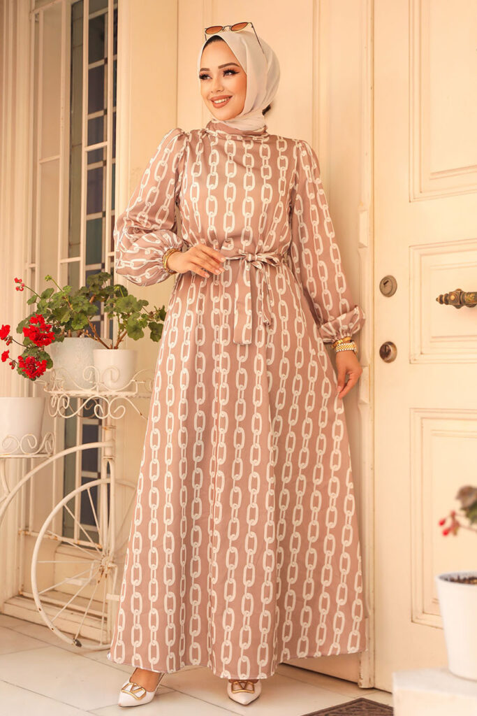 فستان سهرة حجاب – فستان سهرة حجاب بني منقوش 39211kh