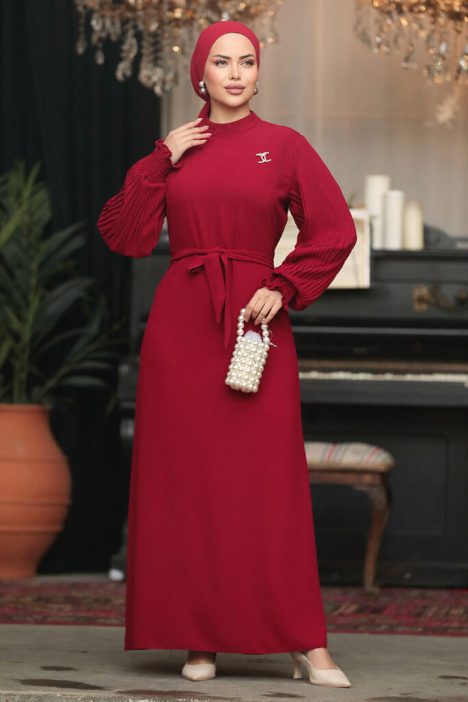 نيفا ستايل – فستان حجاب أحمر كلاريت بحزام 30013br