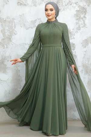 فستان سهرة حجاب – فستان سهرة حجاب كاكي مع تفاصيل كيب 47381hk