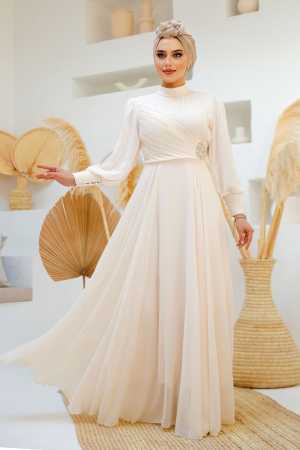فستان سهرة للحجاب – بيج فستان سهرة للحجاب مع تفاصيل طيات 45221 بيج