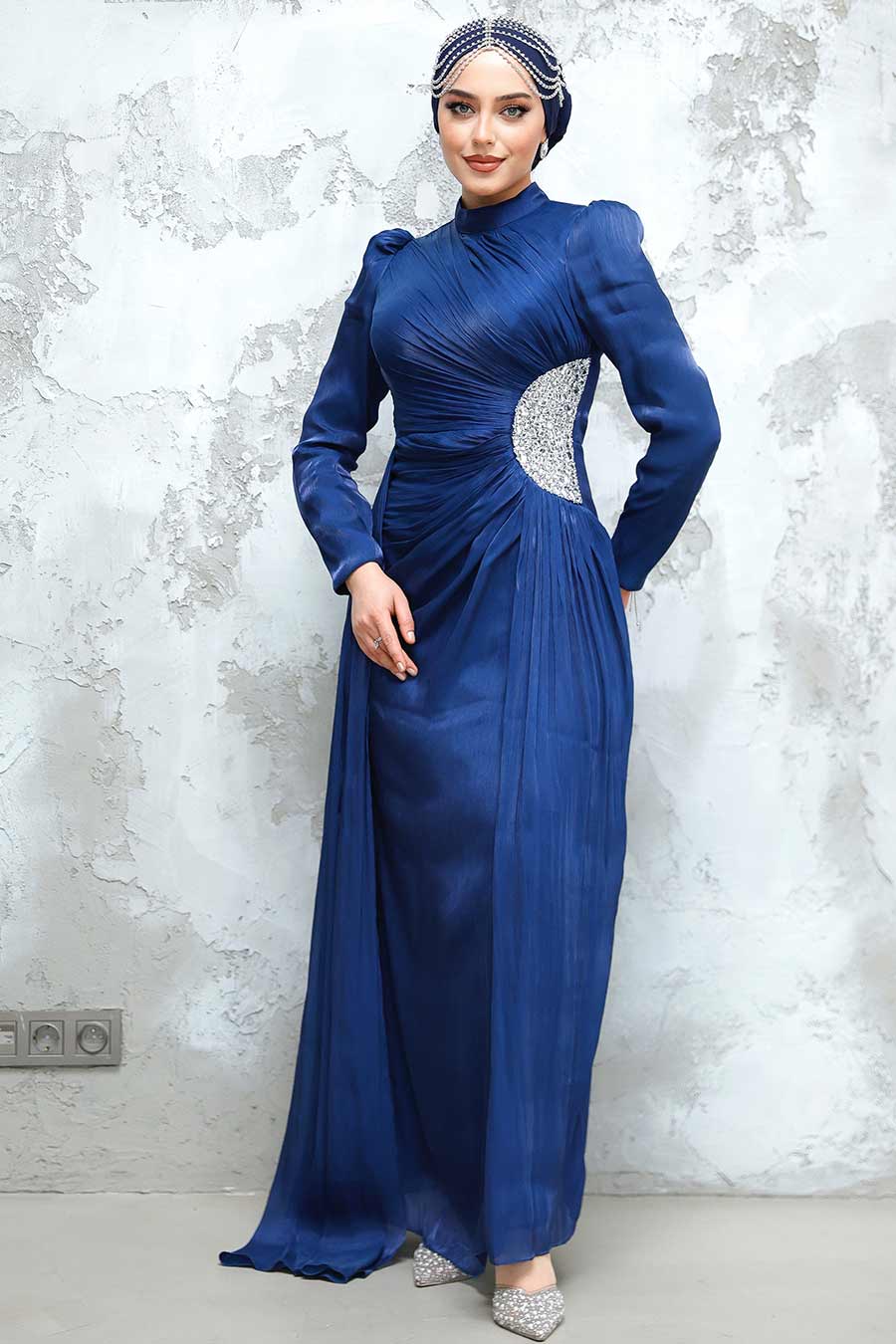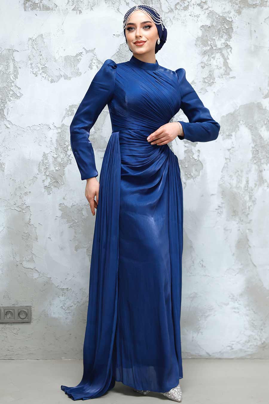 فستان سهرة للحجاب – فستان سهرة للحجاب باللون الأزرق الداكن مع تفاصيل ثنيات 4919l