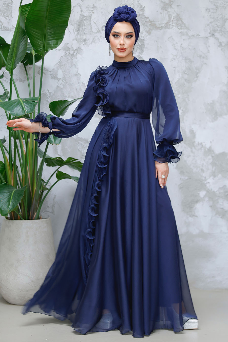 فستان سهرة للحجاب – فستان سهرة للحجاب باللون الأزرق الداكن مع تفاصيل كشكش 48571l