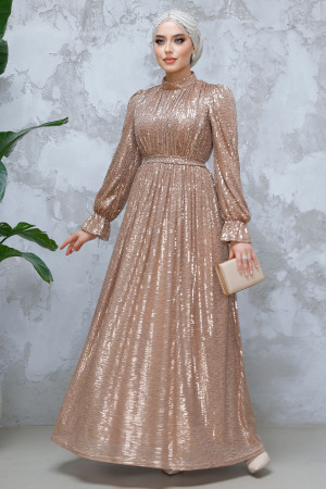 فستان سهرة للحجاب – بيج فستان سهرة للحجاب مع ربطة عنق 48051 بيج