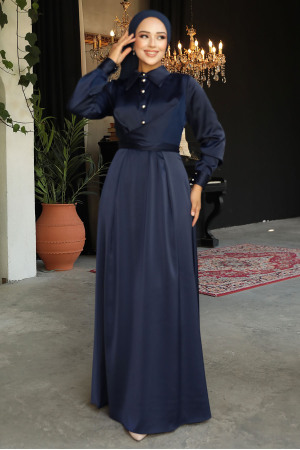 فستان من الساتان باللون الأزرق الداكن مزين بأزرار 45661l
