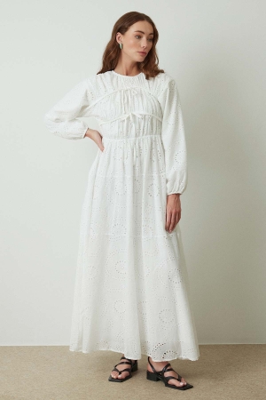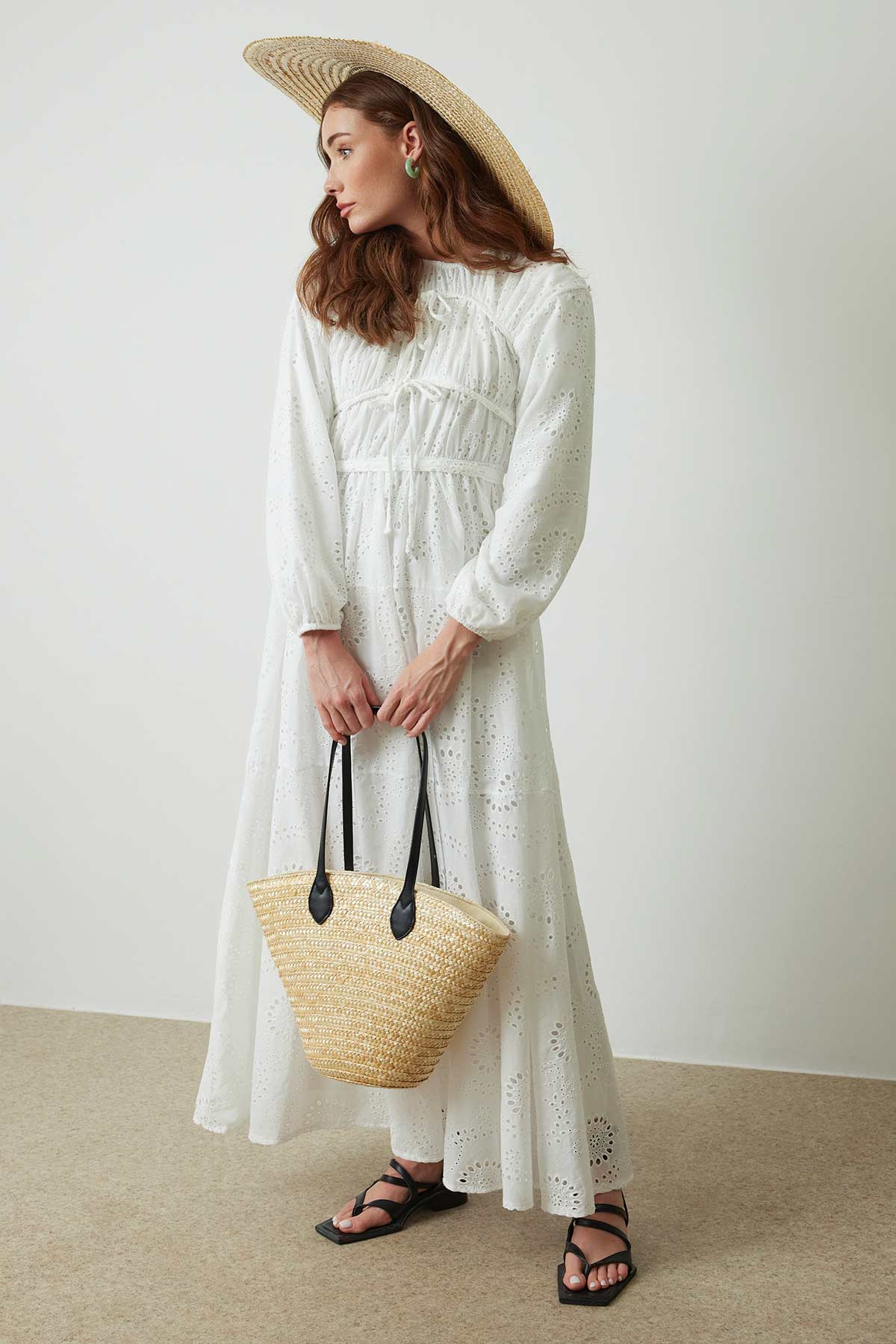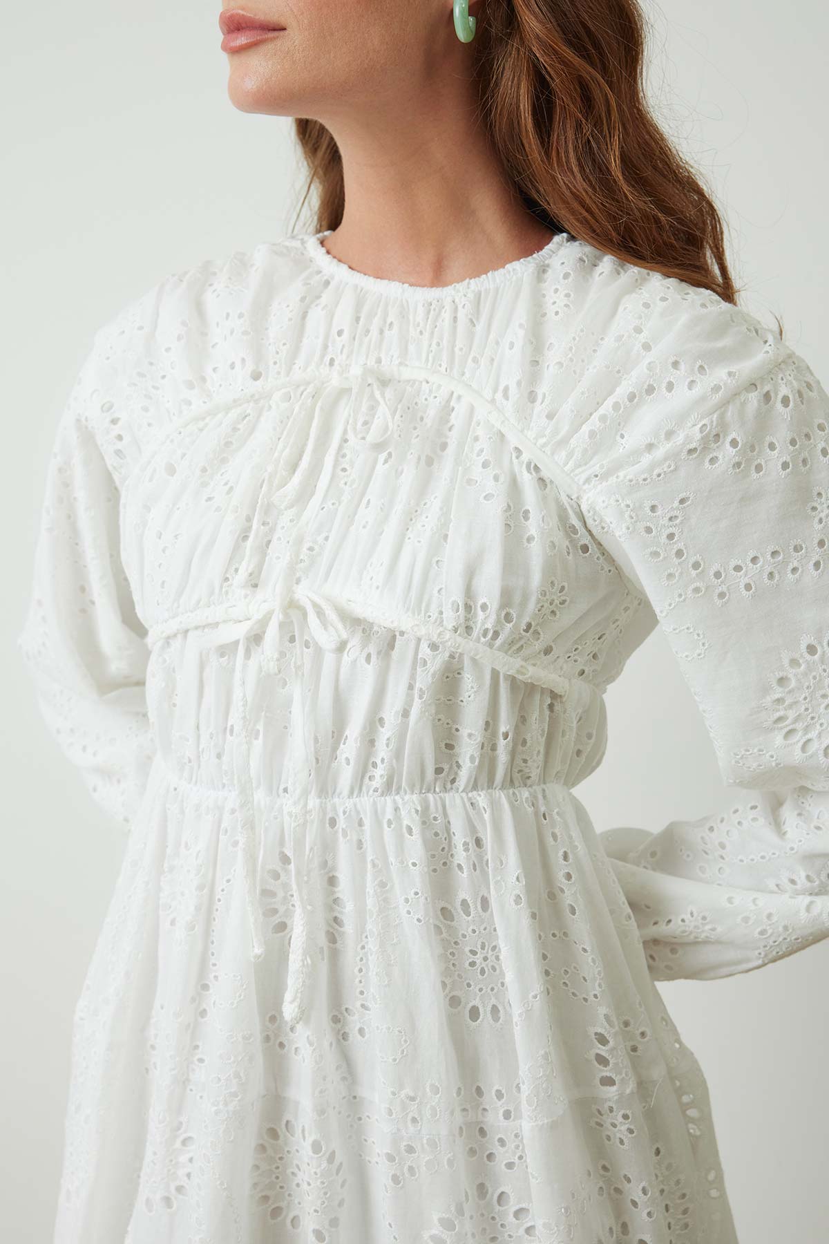 فستان Petit Brode مع تفاصيل ربطة أمامية، وبطانة من قماش الدينيير، مع خصر مرن رفيع، وربطة عنق أمامية، وحزام متحرك 100%.