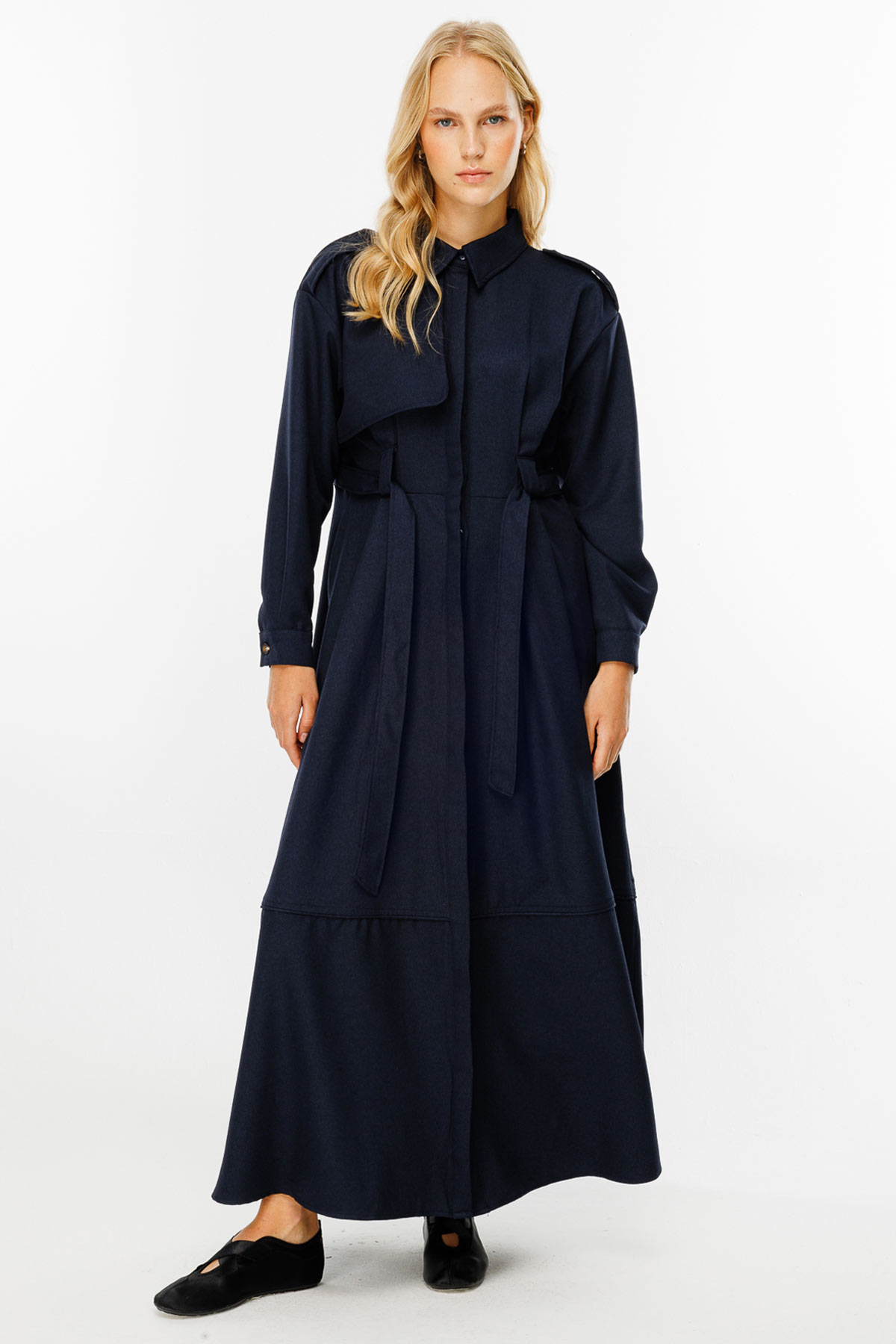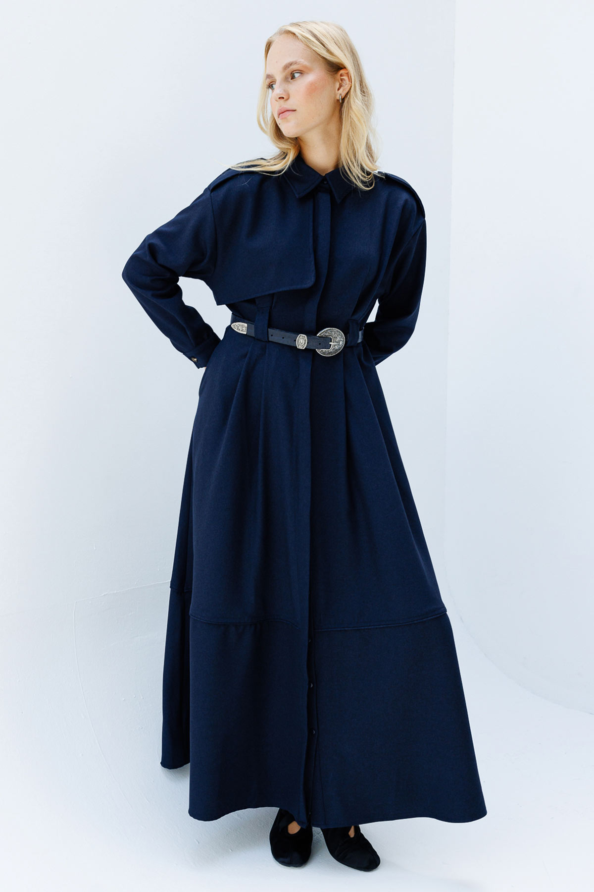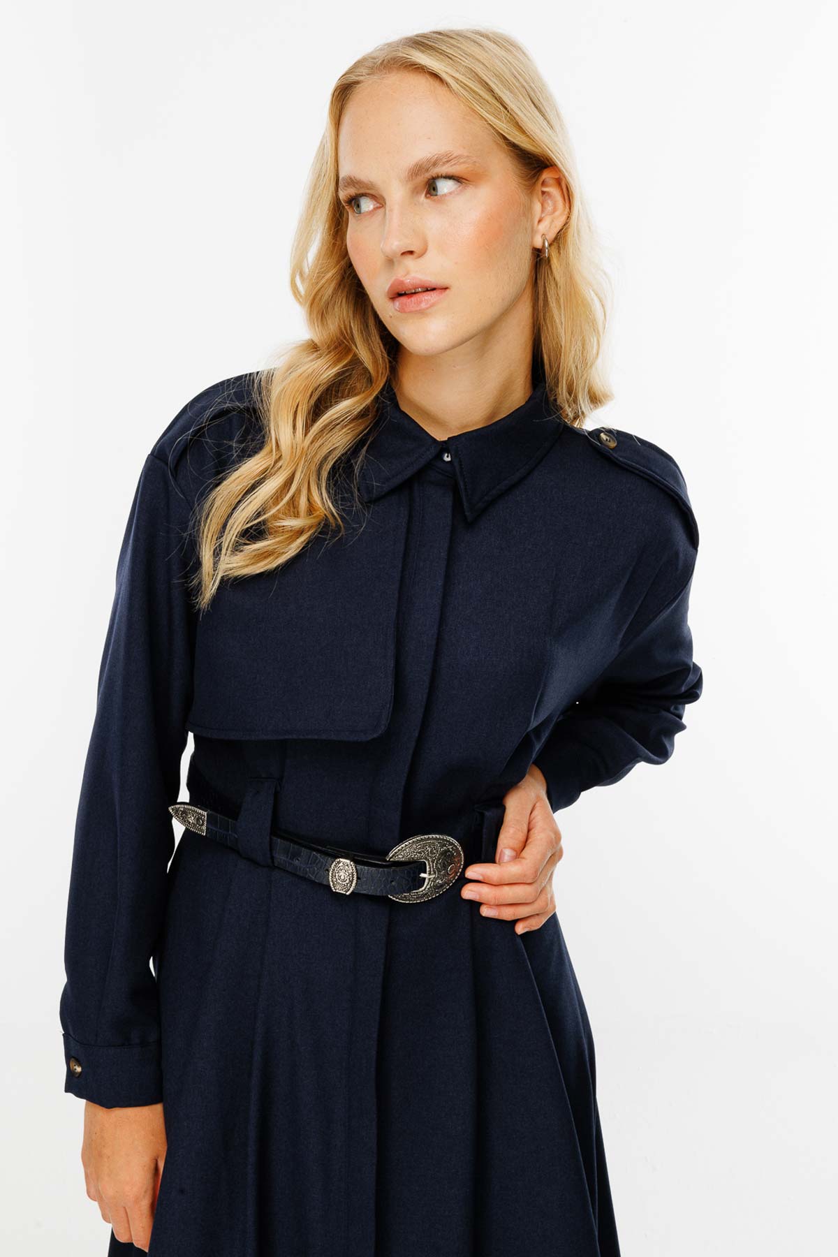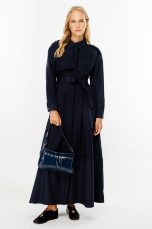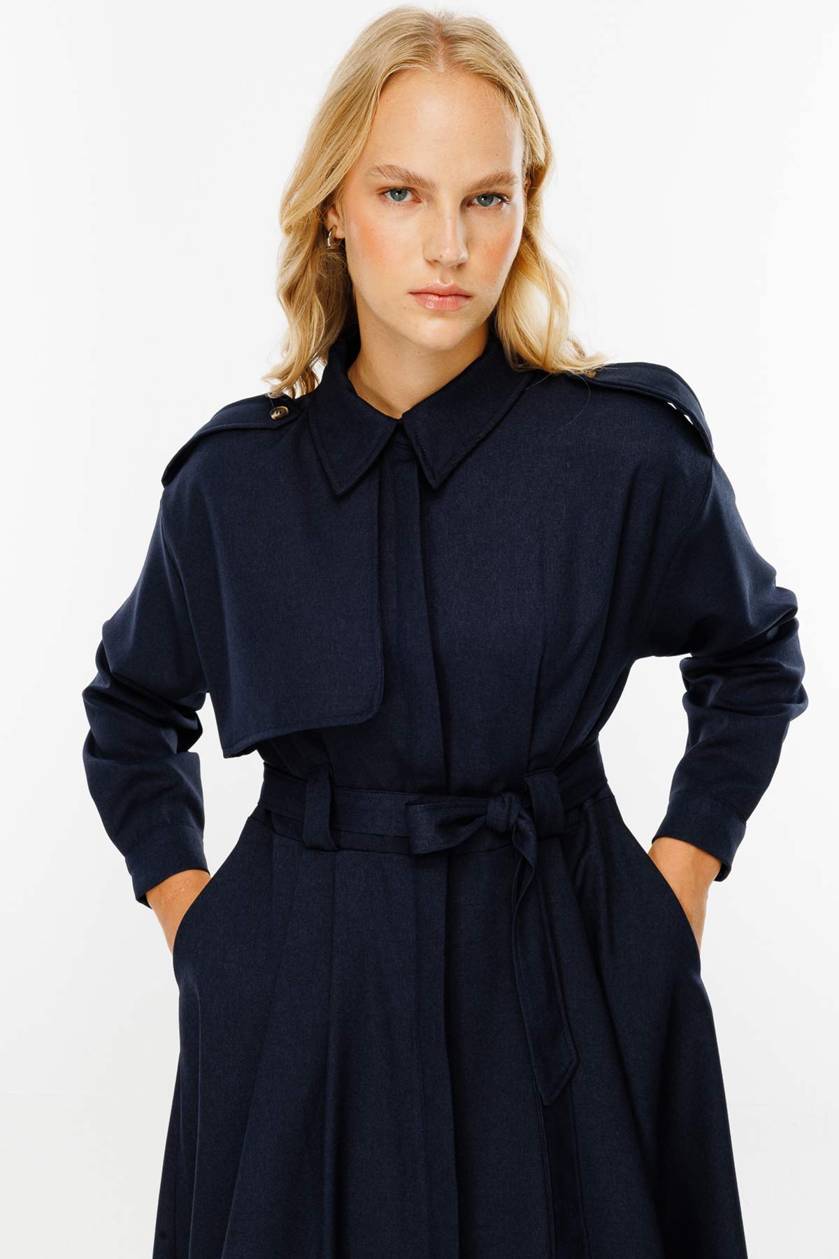 فستان ممتاز باللون الأزرق الداكن، فستان ترنش بياقة قميص، وأزرار مع فتحة مخفية في الأمام، وتفصيل كتاف على الأكمام وجيوب مخفية على الجوانب، وحزام من القماش الفاخر. محتوى القماش وتعليمات الغسيل: 64% بيس، 35% فيسكون، 4% ليكرا. يُغسل في الغسالة على درجة حرارة 30 درجة في دورة قصيرة، ويُغسل بلطف. اغتسل بالخارج يُكوى بدرجة حرارة منخفضة. مقاس المنتج: S-M مقاسات الموديل: الارتفاع: 1.72 سم، الصدر: 76 سم، الخصر: 64 سم، الأرداف: 88 سم