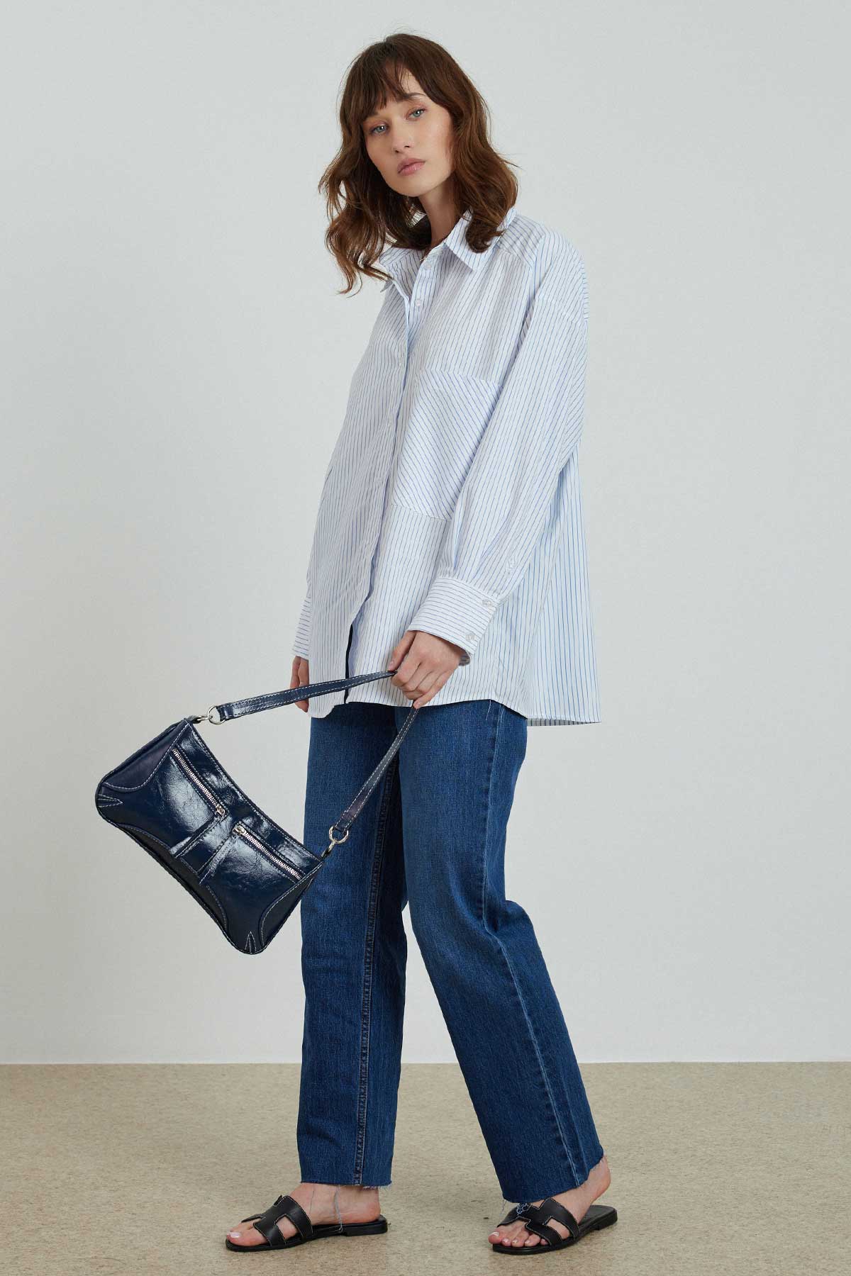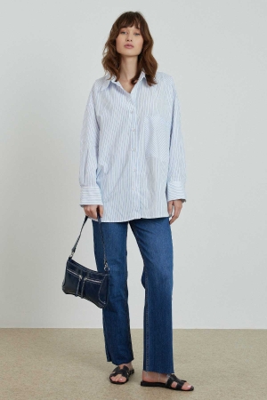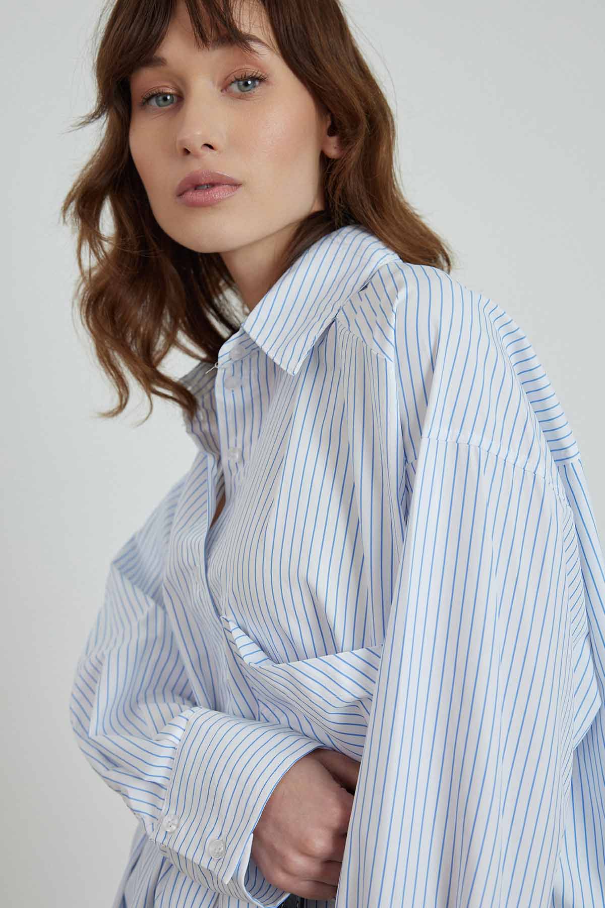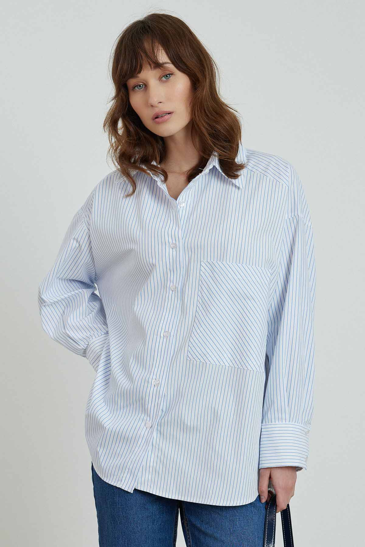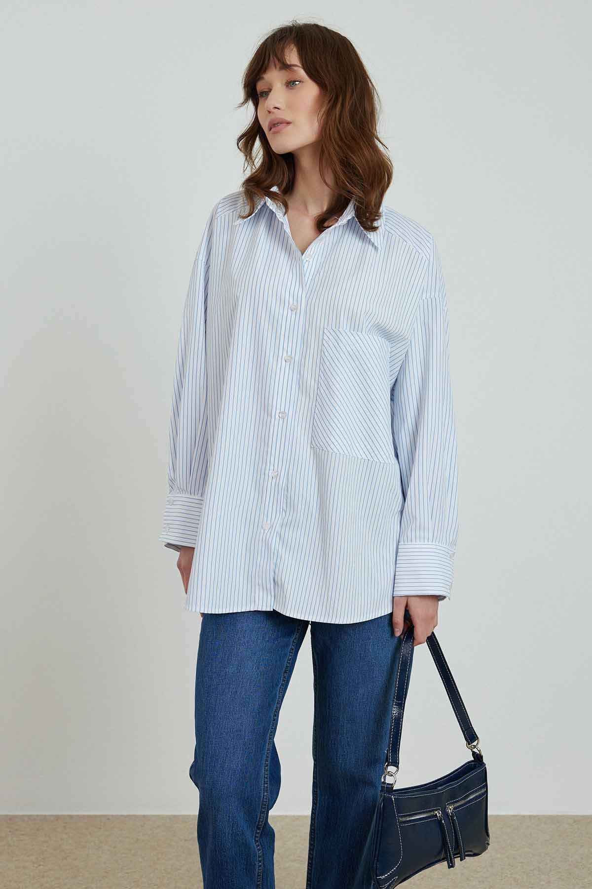 مميزات القميص المخطط كبير الحجم: أكتاف منسدلة، ياقة القميص، جيوب أمامية، قصة مريحة، قميص مخطط كبير الحجم مع أزرار خاصة على شكل حلقات. 100% قطن