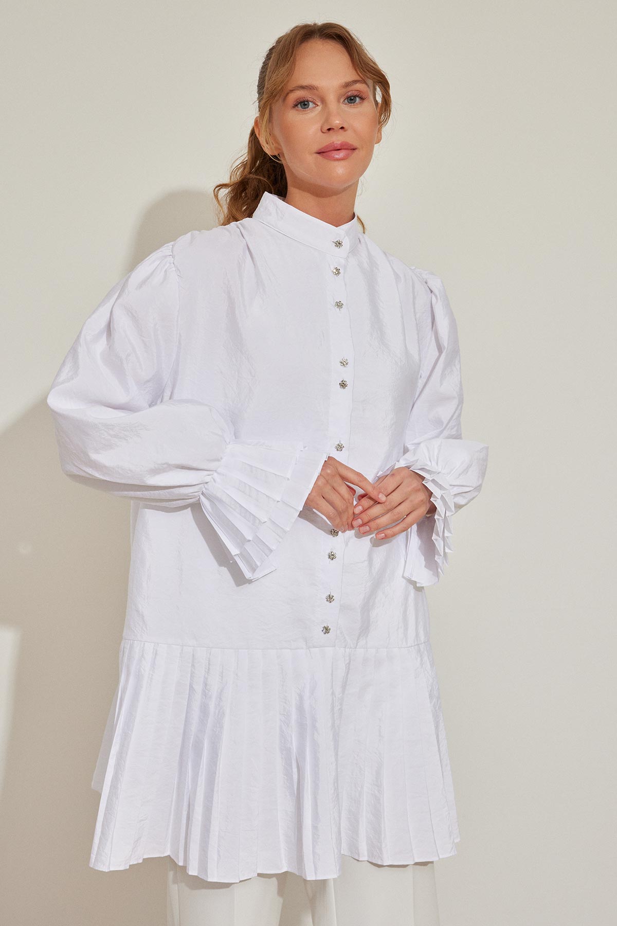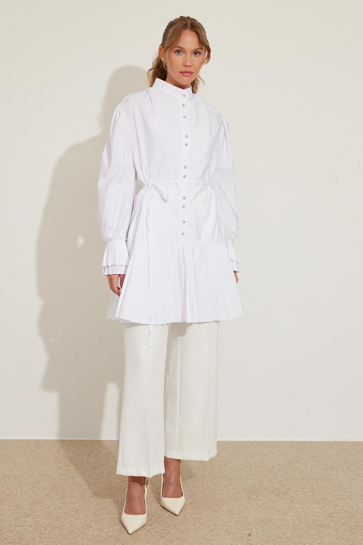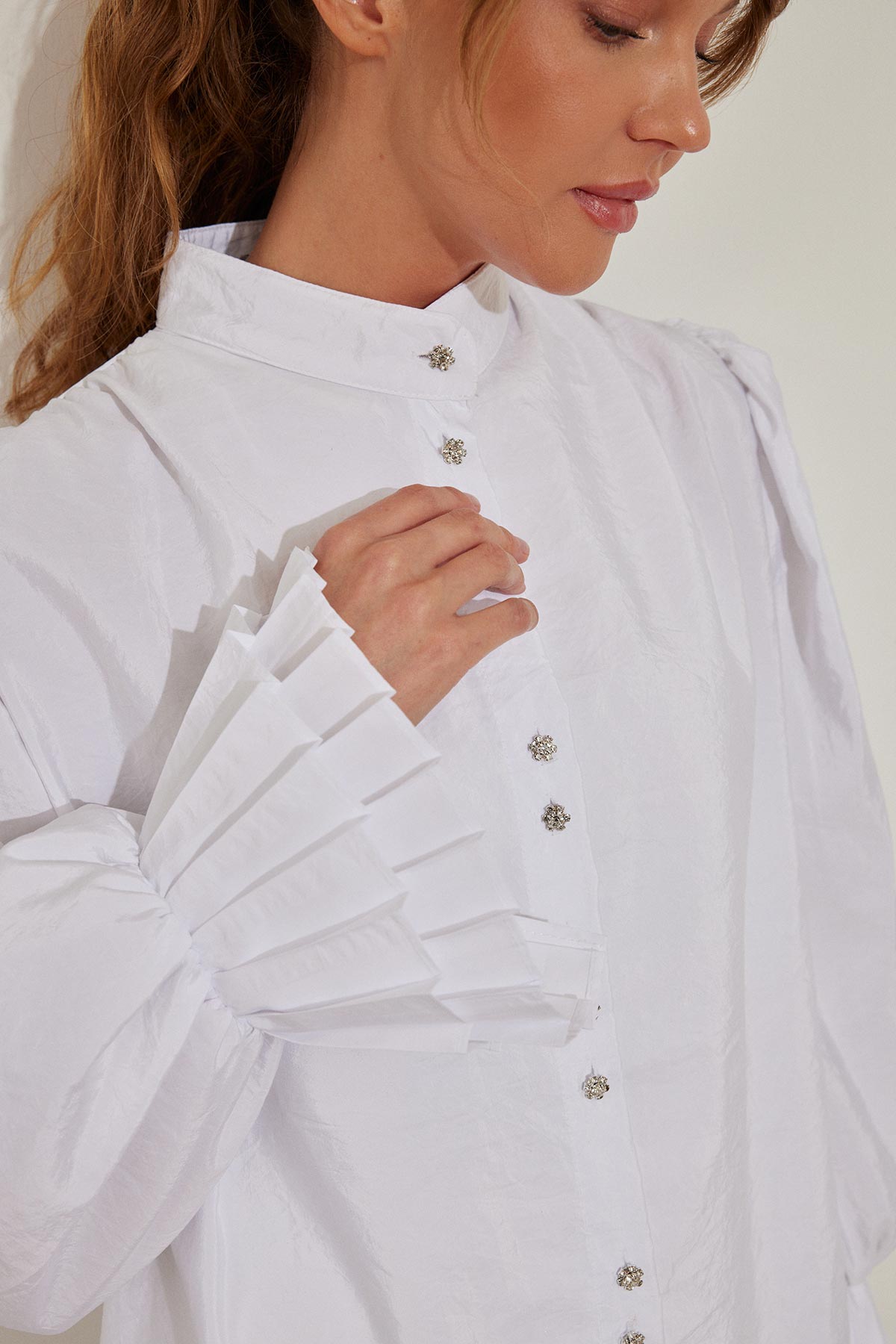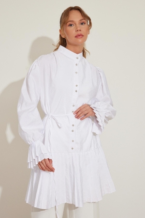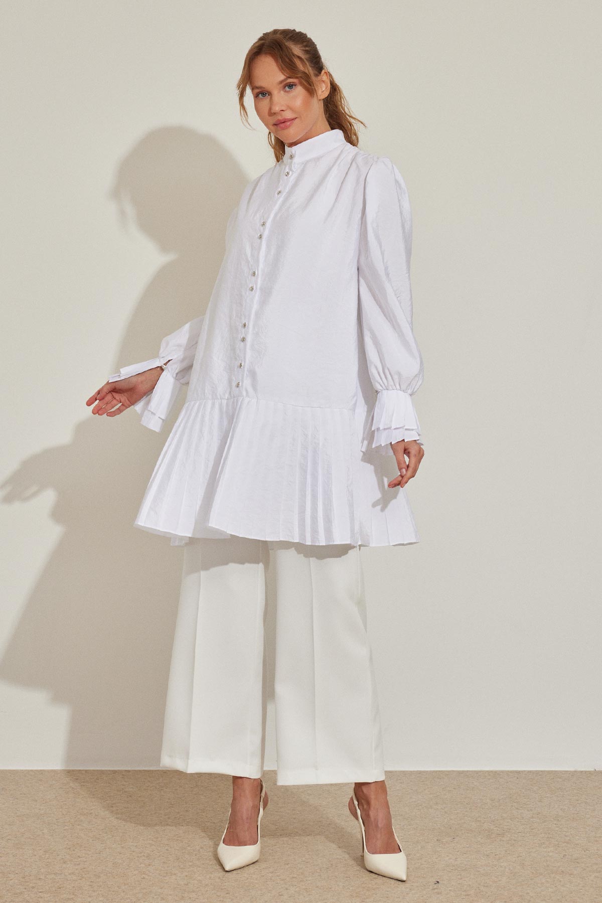 قميص أبيض مع تفاصيل الطية