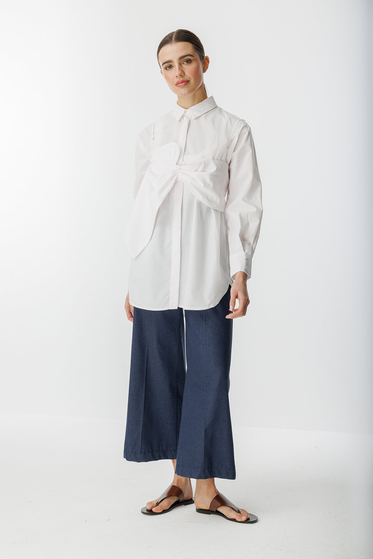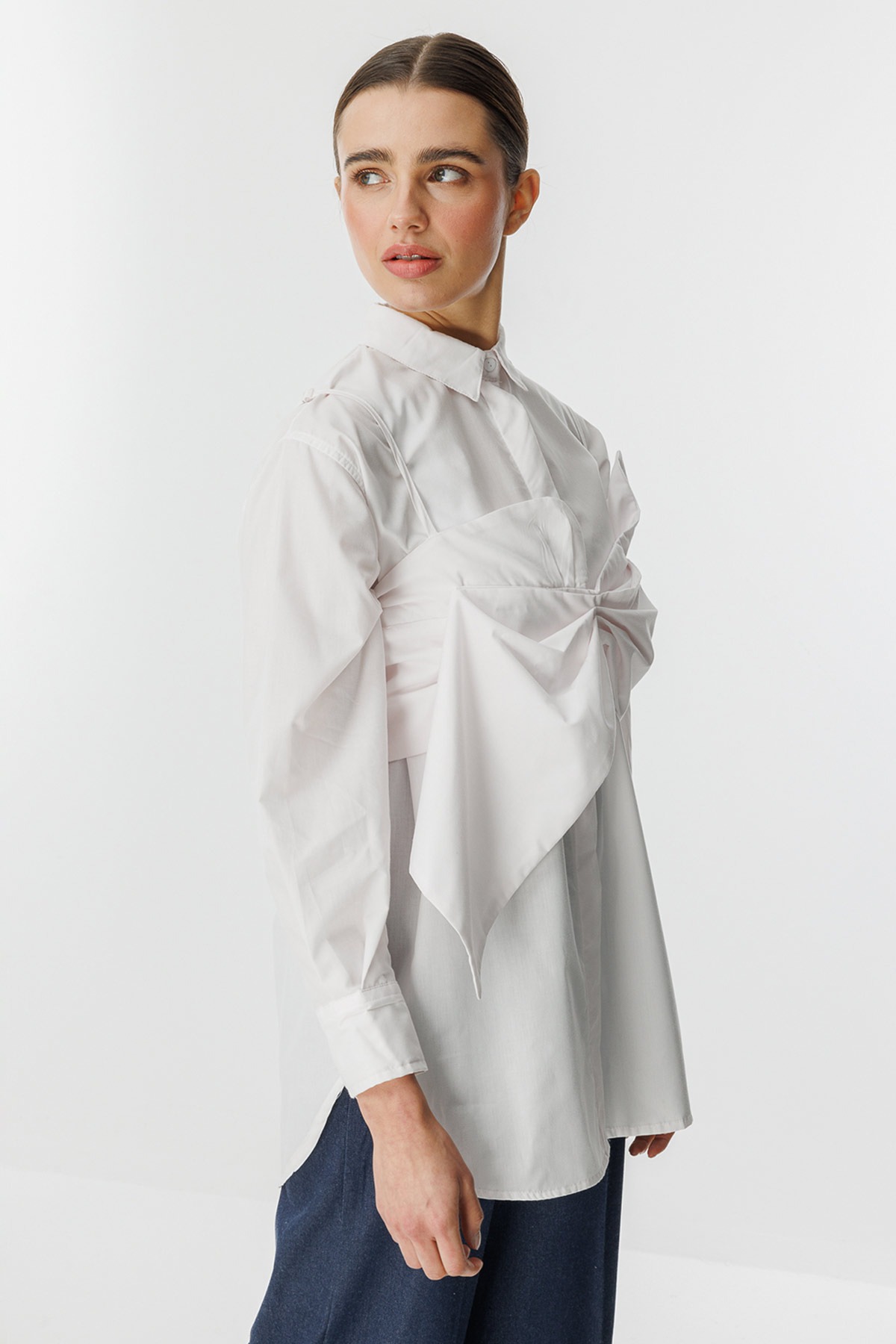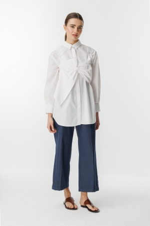 قميص أبيض بميزات تفاصيل القوس: ياقة القميص، أزرار فتحة مخفية، تفاصيل إكسسوارات القوس، صدرية مشحونة بأجزاء إضافية، سحاب خلفي، قميص ملائم تمامًا. محتوى القماش وتعليمات الغسيل: 100% قطن، غسيل لطيف عند درجة حرارة 30 درجة كحد أقصى. يُغسل بالبرامج الاصطناعية والحساسة. مقاس المنتج: S مقاسات الموديل: الارتفاع: 1.72 سم، الصدر: 80 سم، الخصر: 60 سم، الأرداف: 90 سم