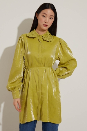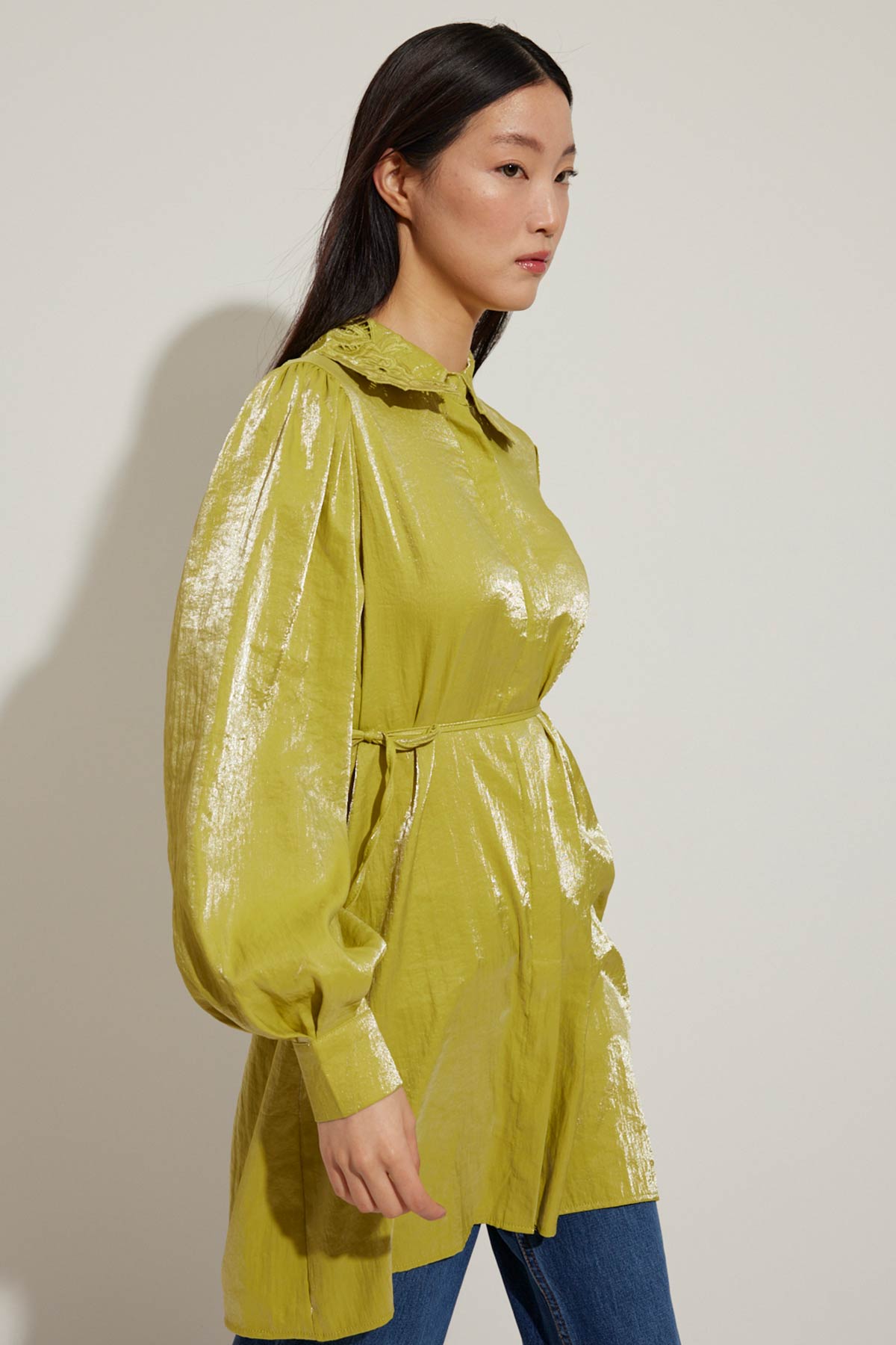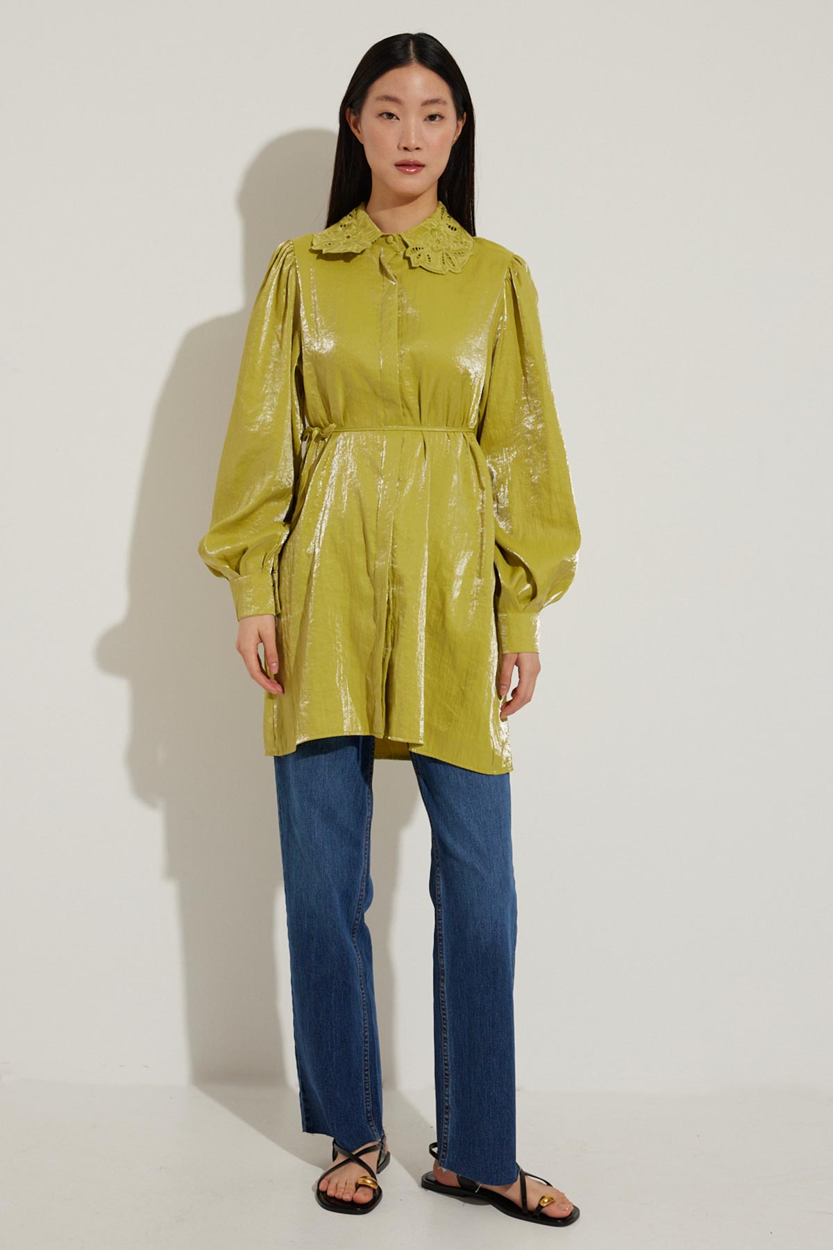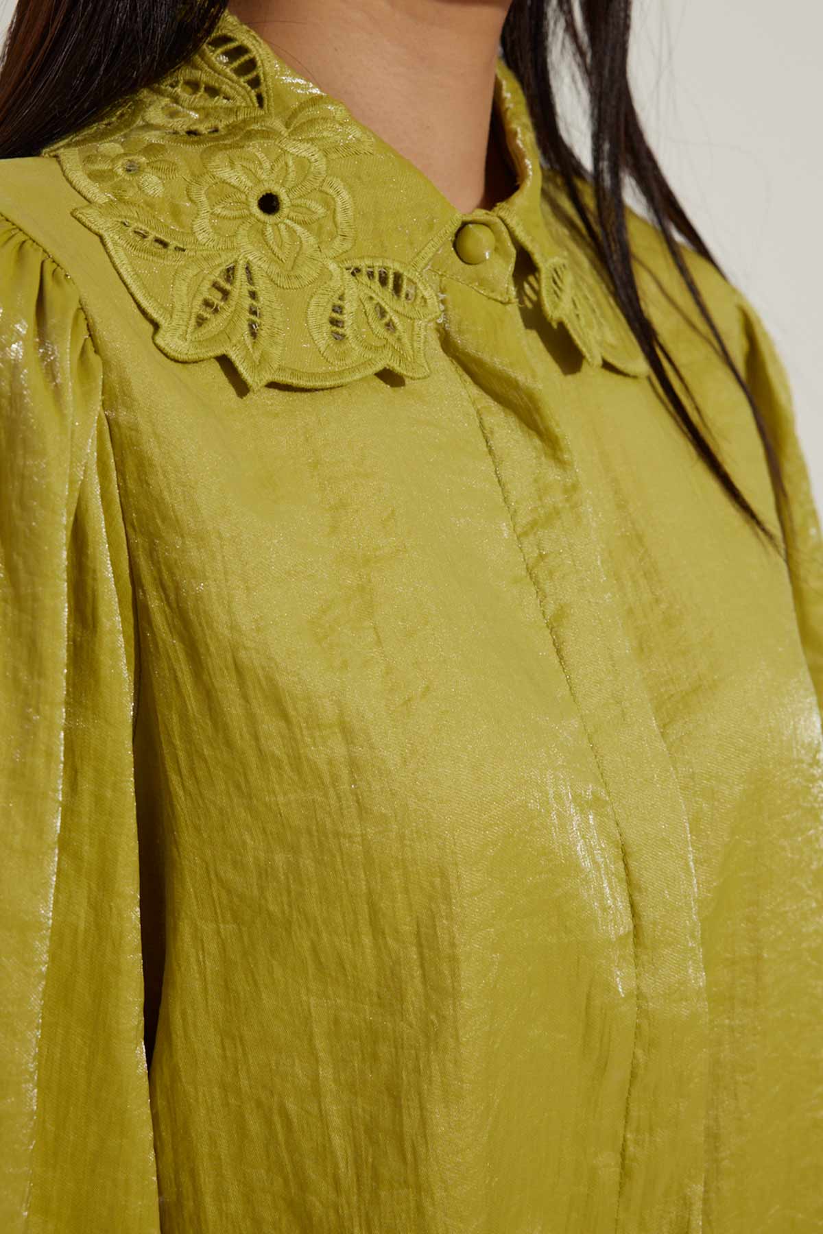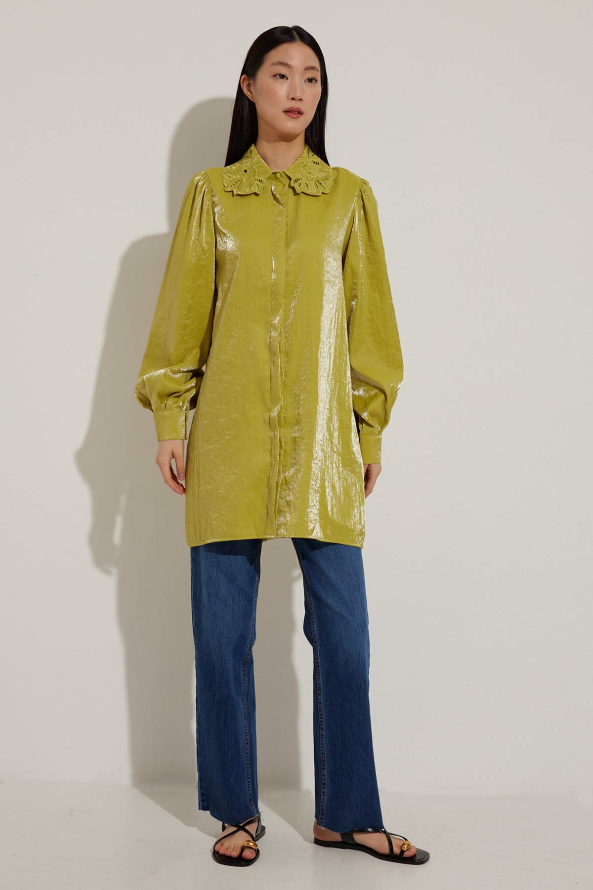 مميزات القميص بياقة مطرزة: قميص بتطريز على الياقة، فتحة أمامية مخفية، أكمام منتفخة، أساور أكمام وطيات، حزام متحرك رفيع مصنوع من قماشه الخاص، قصة مريحة، قميص ذو ملمس مشرق 80% نايلون 20% بيس، غسيل لطيف. تنظيف جاف.