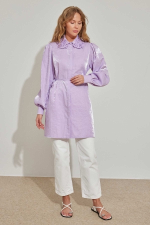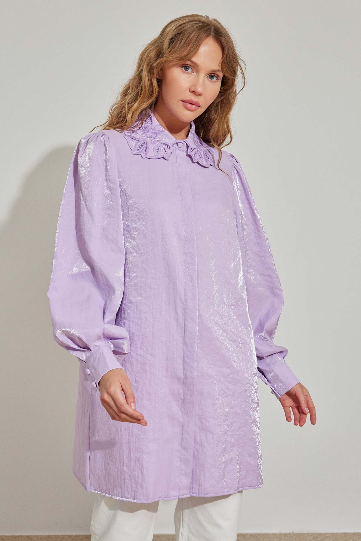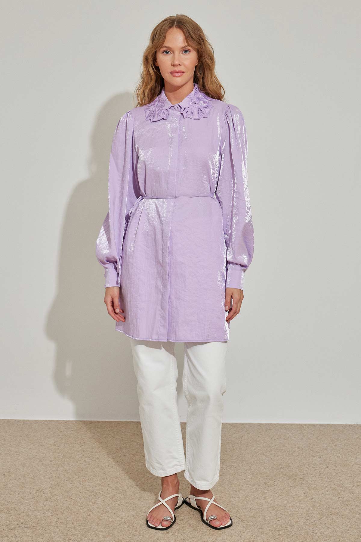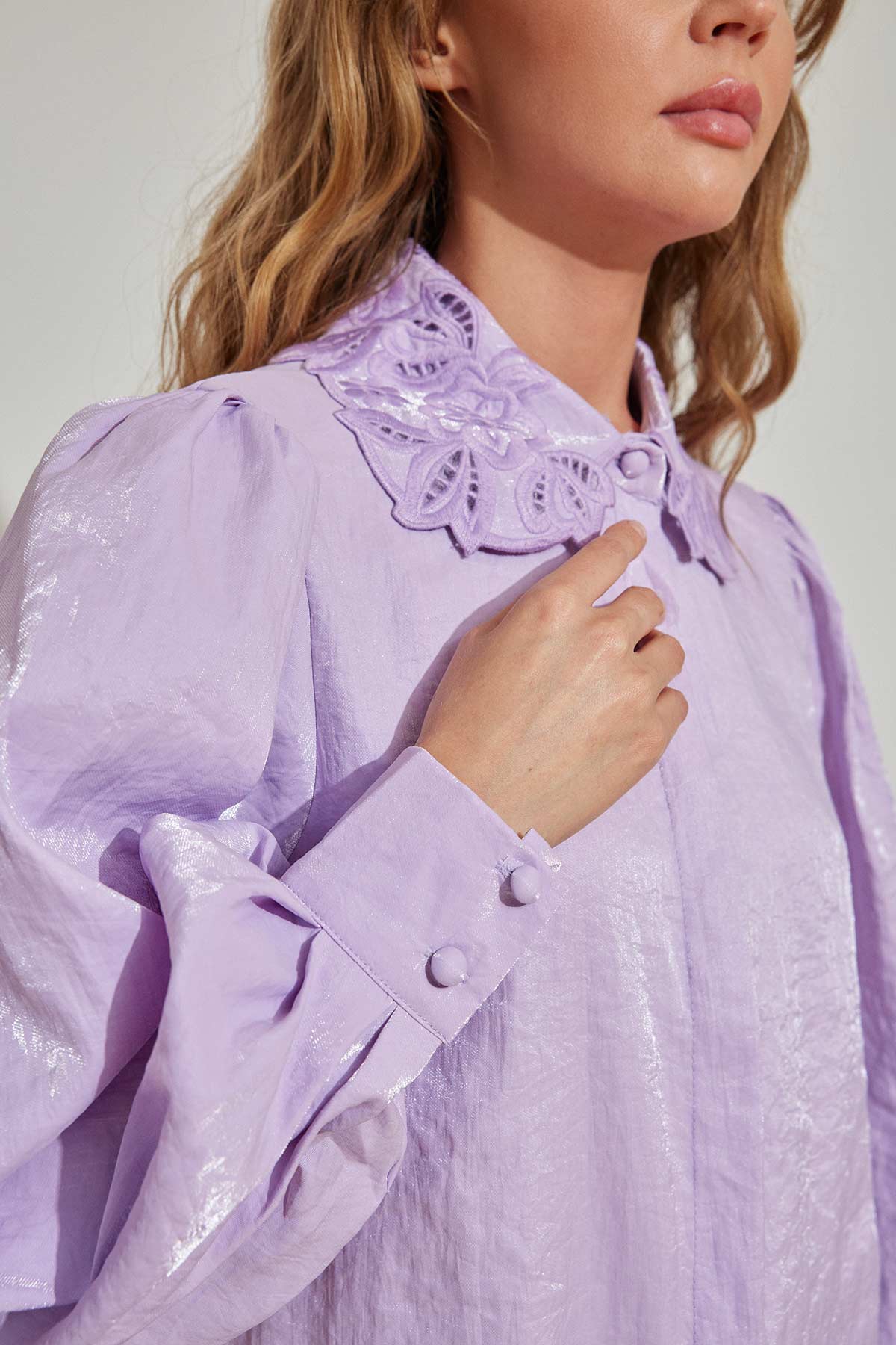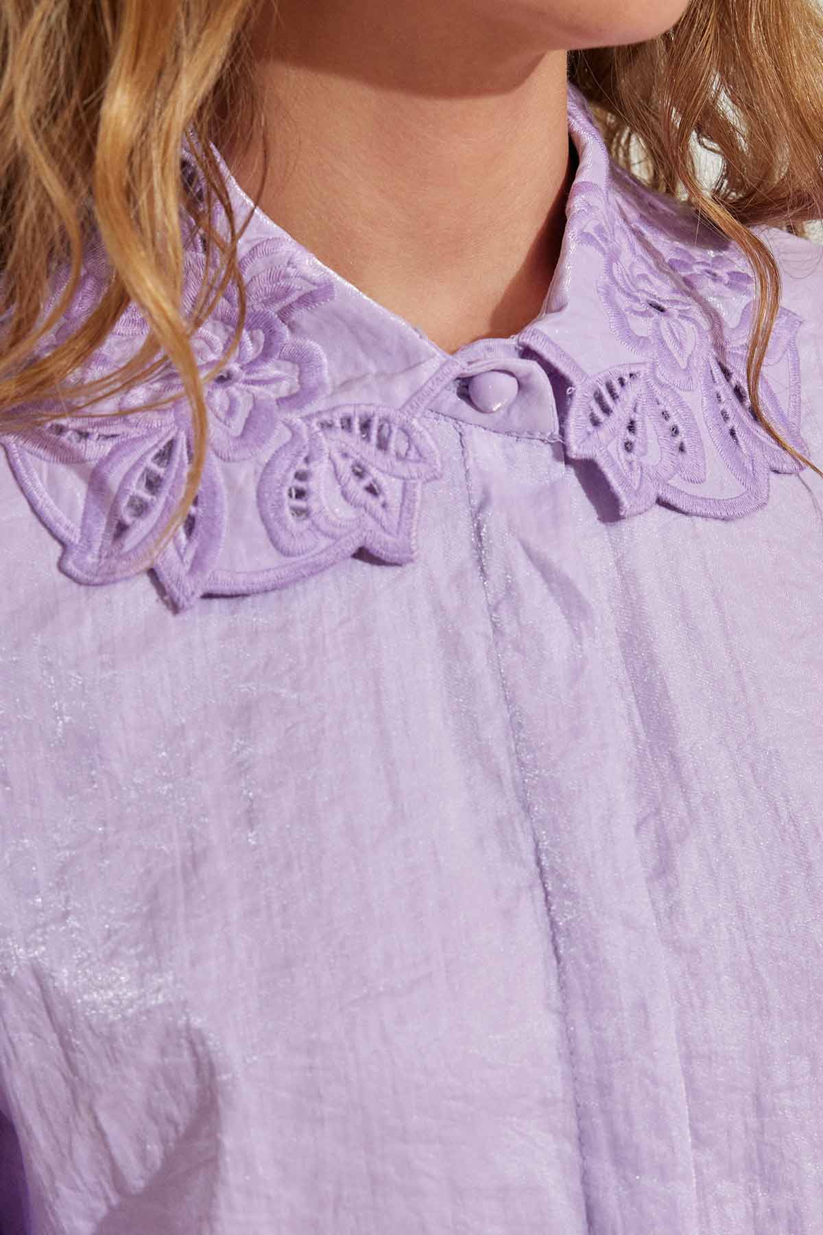 مميزات القميص بياقة مطرزة: قميص بتطريز على الياقة، فتحة أمامية مخفية، أكمام منفوخة، أساور وتفاصيل ثنيات، حزام متحرك رفيع مصنوع من قماشه الخاص، قصة مريحة، ملمس مشرق. 80% نايلون 20% بيس غسيل لطيف. تنظيف جاف.