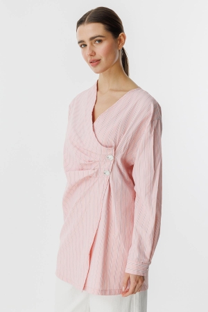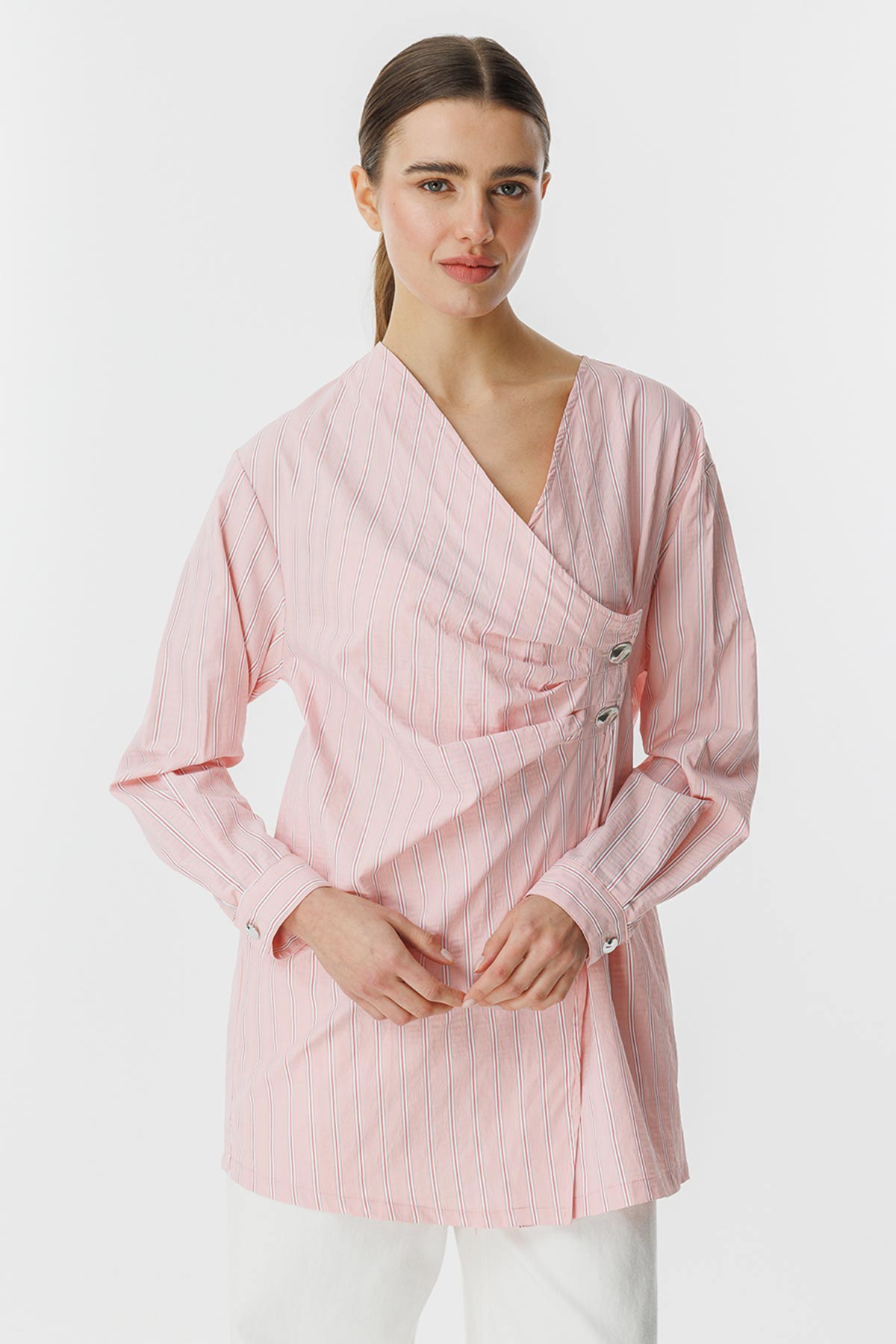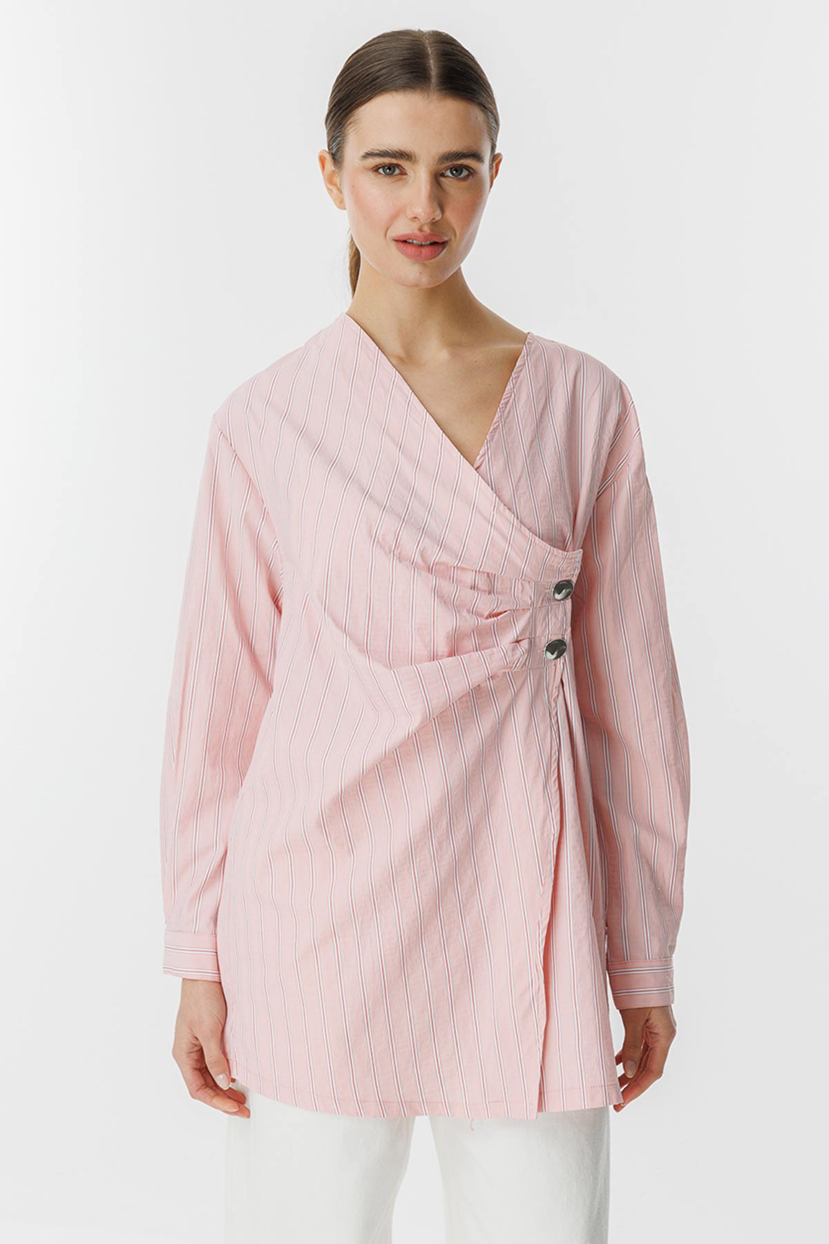 قميص بوبلين مخطط ومغلق من الجانب، يتميز برقبة على شكل حرف V، وقميص مخطط مع طيات جانبية وتفاصيل أزرار معدنية. محتوى القماش وتعليمات الغسيل: 100% قطن يُغسل في درجة حرارة أقصاها 30 درجة. يُكوى بشكل عكسي على درجة حرارة منخفضة. مقاس المنتج: S مقاسات الموديل: الارتفاع: 1.72 سم، الصدر: 80 سم، الخصر: 60 سم، الأرداف: 90 سم