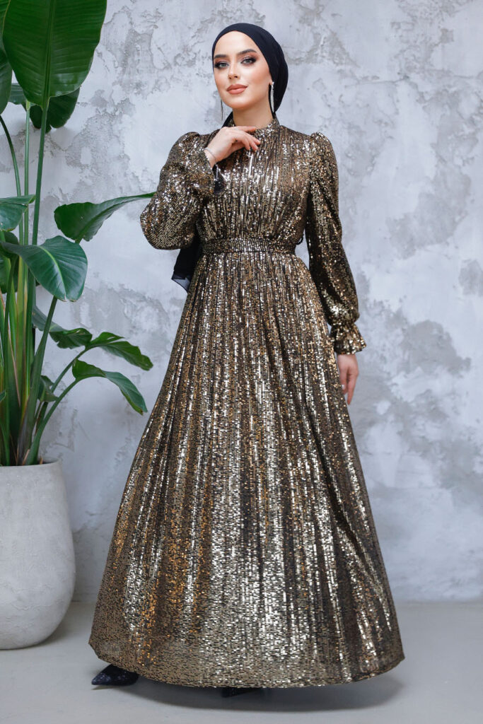 فستان سهرة حجاب – فستان سهرة حجاب ذهبي مطرز 44961gold