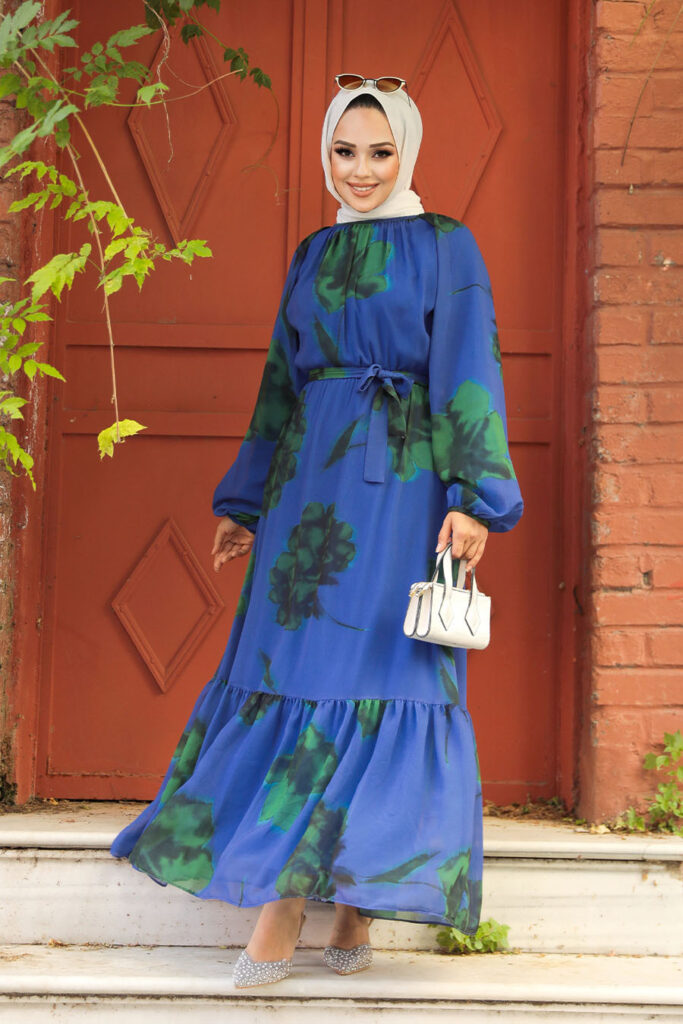 فستان حجاب أزرق نيلي منقوش بالزهور 60942ım