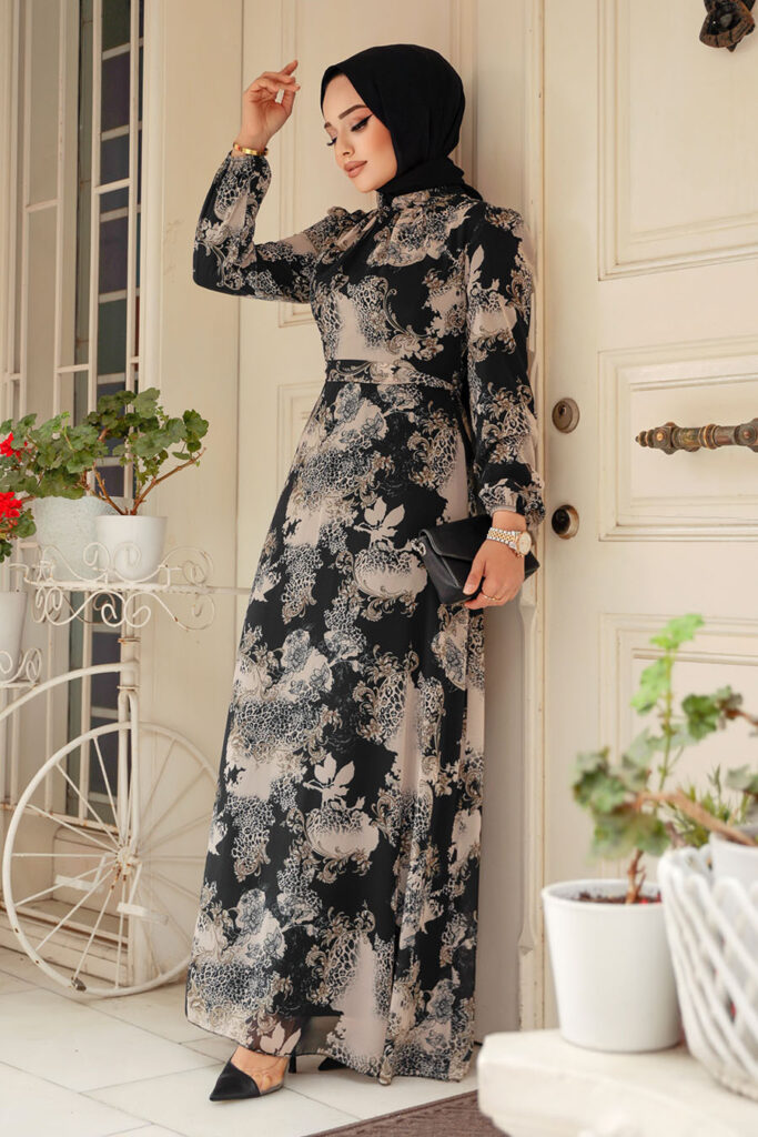 نيفا ستايل – فستان حجاب أسود منقوش بالزهور 27936s