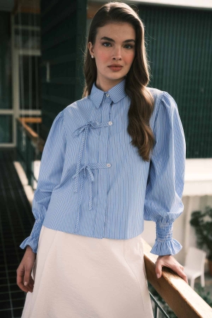 قميص مخطط باللون الأزرق الداكن مع تفاصيل ربطة القوس الميزات: قميص قصير مخطط بقصة كاملة مع ربطة عنق على شكل فيونكة، زر فتحة مخفي، مطوي على الكتف، وأكمام مقواة. محتوى القماش وتعليمات الغسيل: غسيل لطيف بنسبة 100% عند درجة حرارة 30 درجة كحد أقصى. يُكوى بشكل عكسي على درجة حرارة منخفضة. يُغسل بالبرامج الاصطناعية والحساسة. مقاس المنتج الموديل: 36 قياسات العارضة: الارتفاع: 1.71 سم، الصدر: 78 سم، الخصر: 57 سم، الأرداف: 87 سم