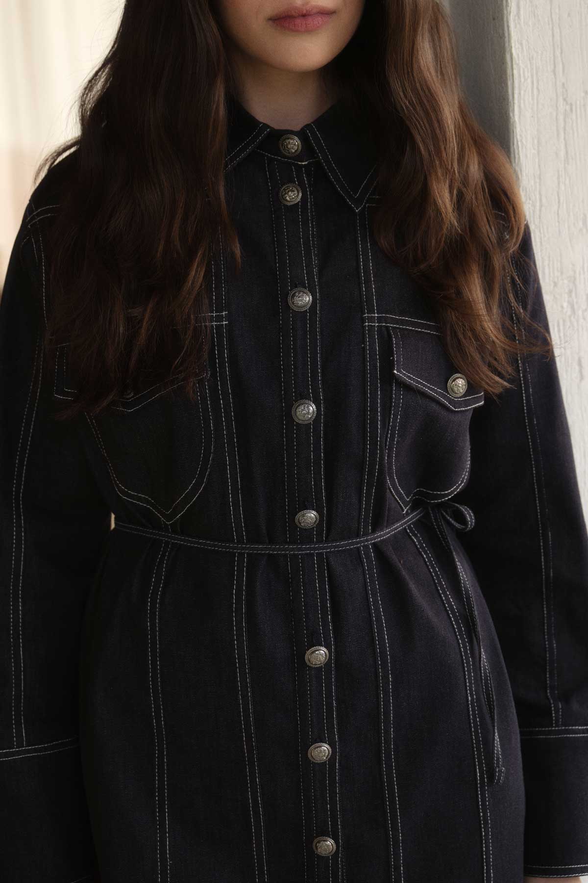 قميص من الدنيم باللون الأزرق الداكن مع تفاصيل بغرز متباينة، ياقة القميص، خياطة متباينة، جيوب أمامية، زر للإغلاق، حزام متحرك من القماش الذاتي، قميص دنيم كامل المقاس. محتوى القماش وتعليمات الغسيل: 98% قطن، 2% ليكرا، يُغسل في درجة حرارة 30 درجة كحد أقصى. يُكوى بشكل عكسي على درجة حرارة منخفضة. يغسل بالماء البارد، لا تستخدم المجفف. مقاس المنتج الموديل: S-M قياسات الموديل: الارتفاع: 1.72 سم، الصدر: 79 سم، الخصر: 61 سم، الأرداف: 89 سم