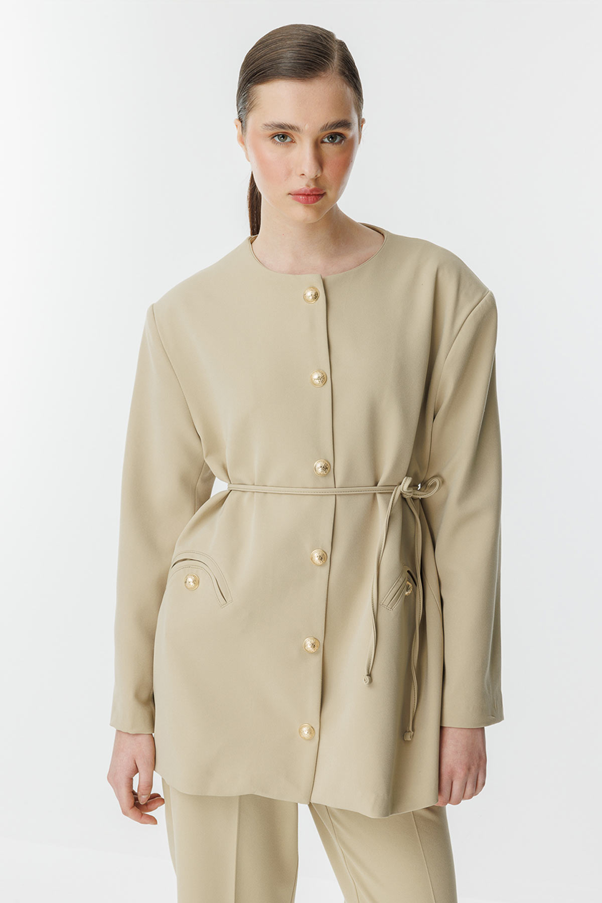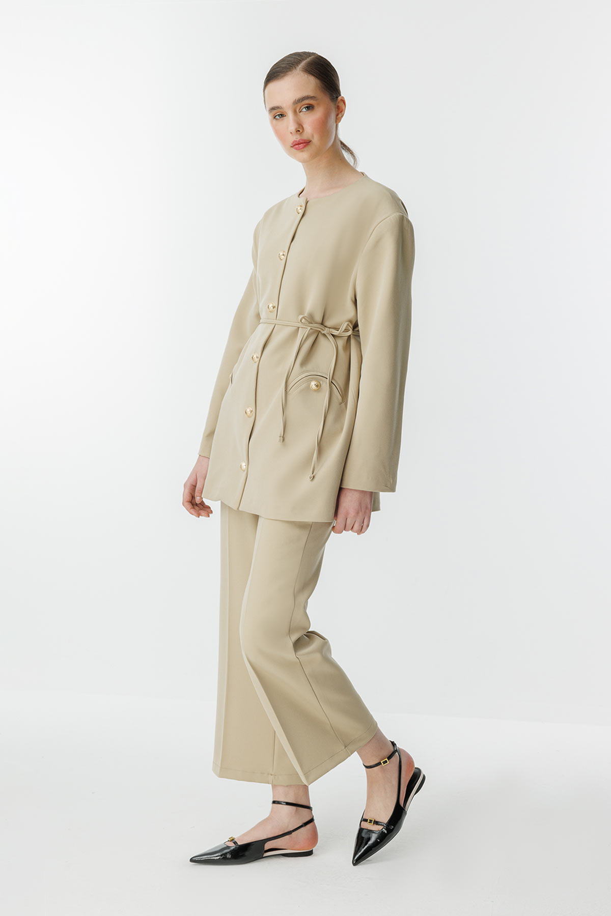 تتميز مجموعة سراويل CAGLA بتفاصيل أزرار PERI GOLD برقبة دائرية، وتفاصيل كبس ذهبية، وجيوب مزخرفة، وسادات، وحزام متحيز من القماش الذاتي، وسترة مبطنة. بدلة بنطلون قصة كاملة مع سحاب جانبي مخفي على البنطلون، ومطاط من الخلف، وجيوب وعلامات حديدية. محتوى القماش وتعليمات الغسيل: 100% تنظيف جاف. مقاس المنتج: S مقاسات الموديل: الارتفاع: 1.78 سم، الصدر: 80 سم، الخصر: 61 سم، الأرداف: 90 سم