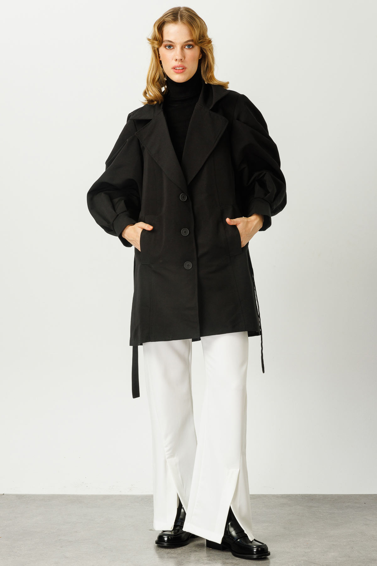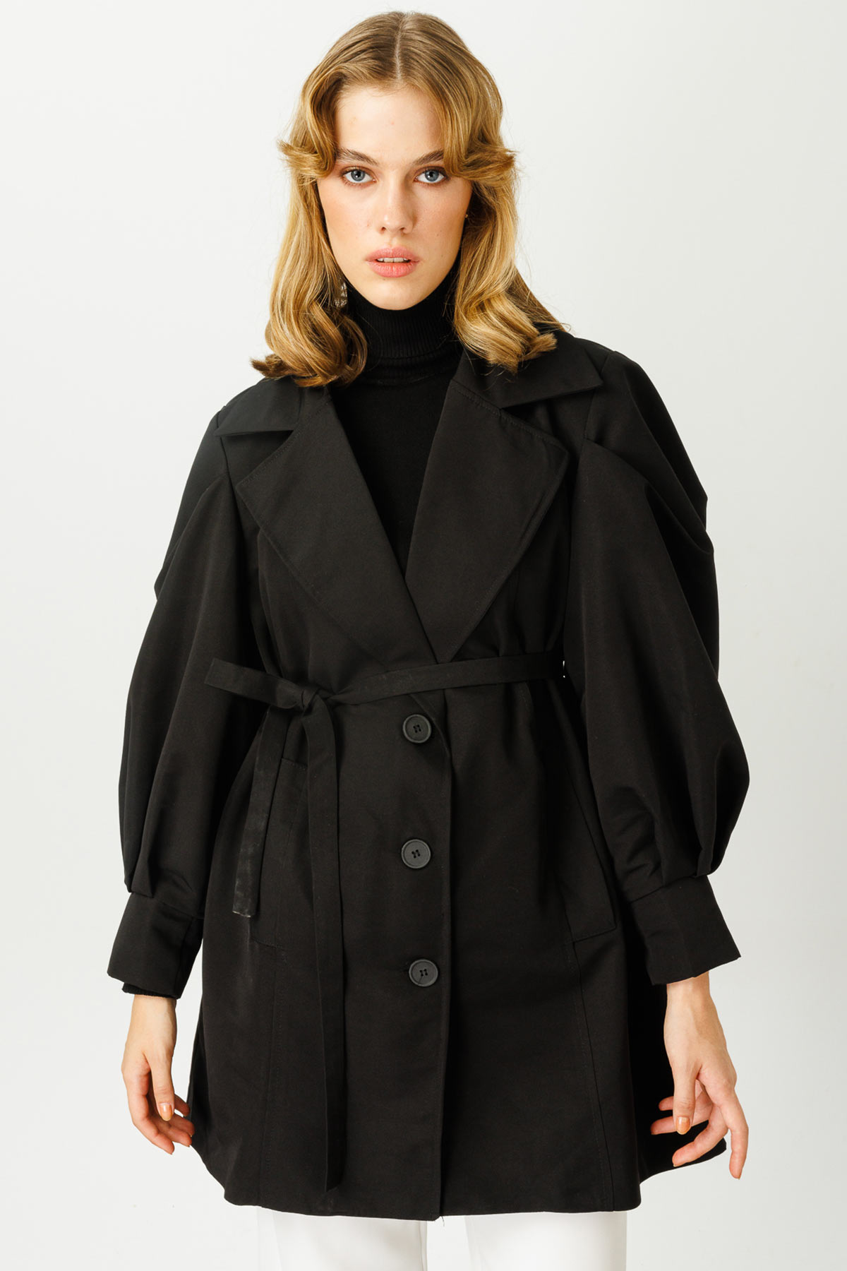 مميزات معطف مارسيليا القصير: معطف واقٍ من المطر مبطن بأكمام منفوخة، وأزرار أمامية، وحزام من القماش نفسه. تنظيف جاف بنسبة 100% فقط.
