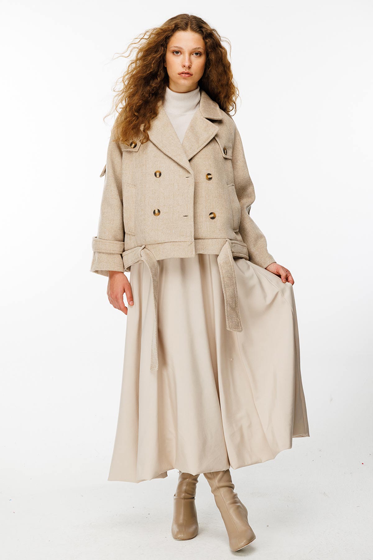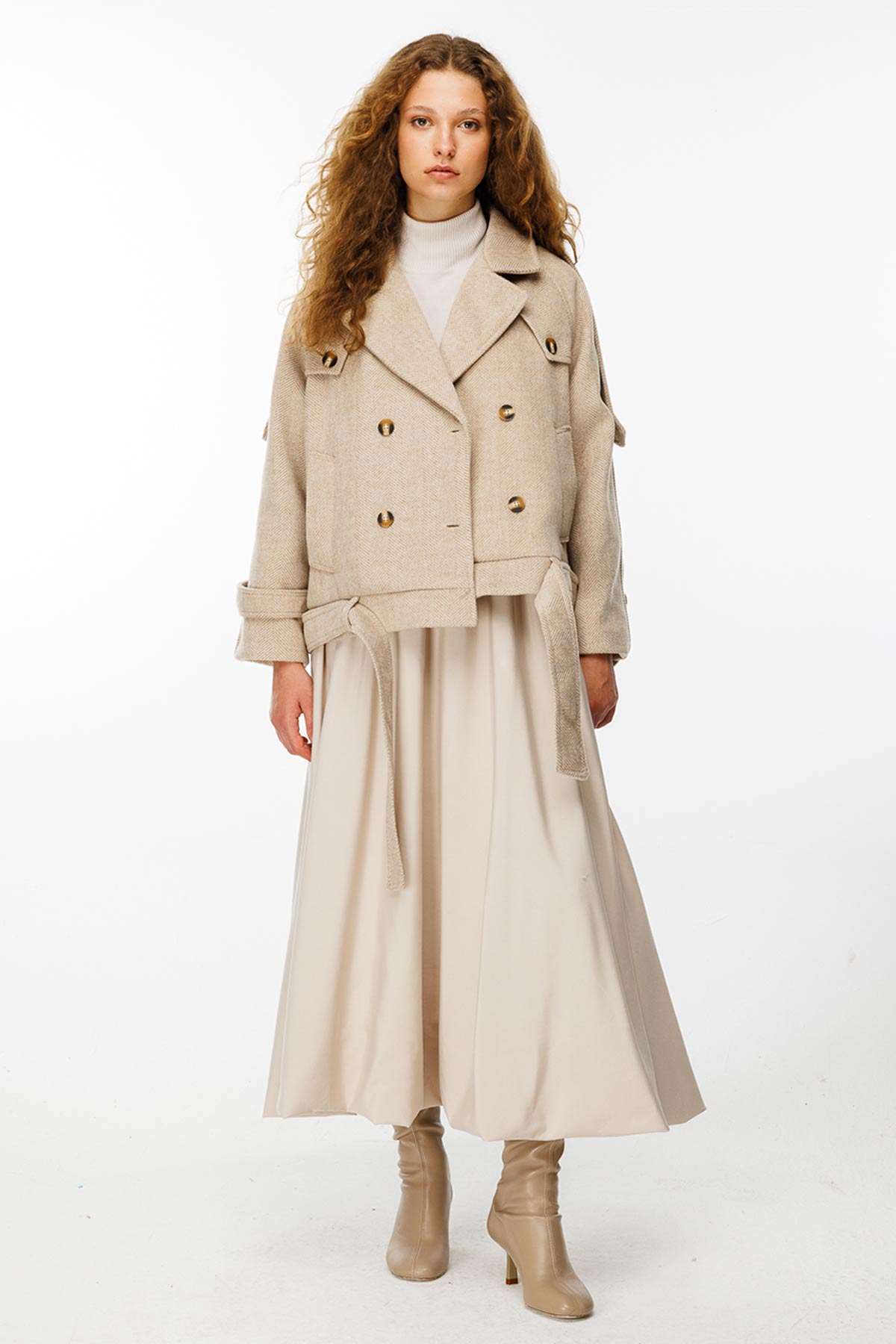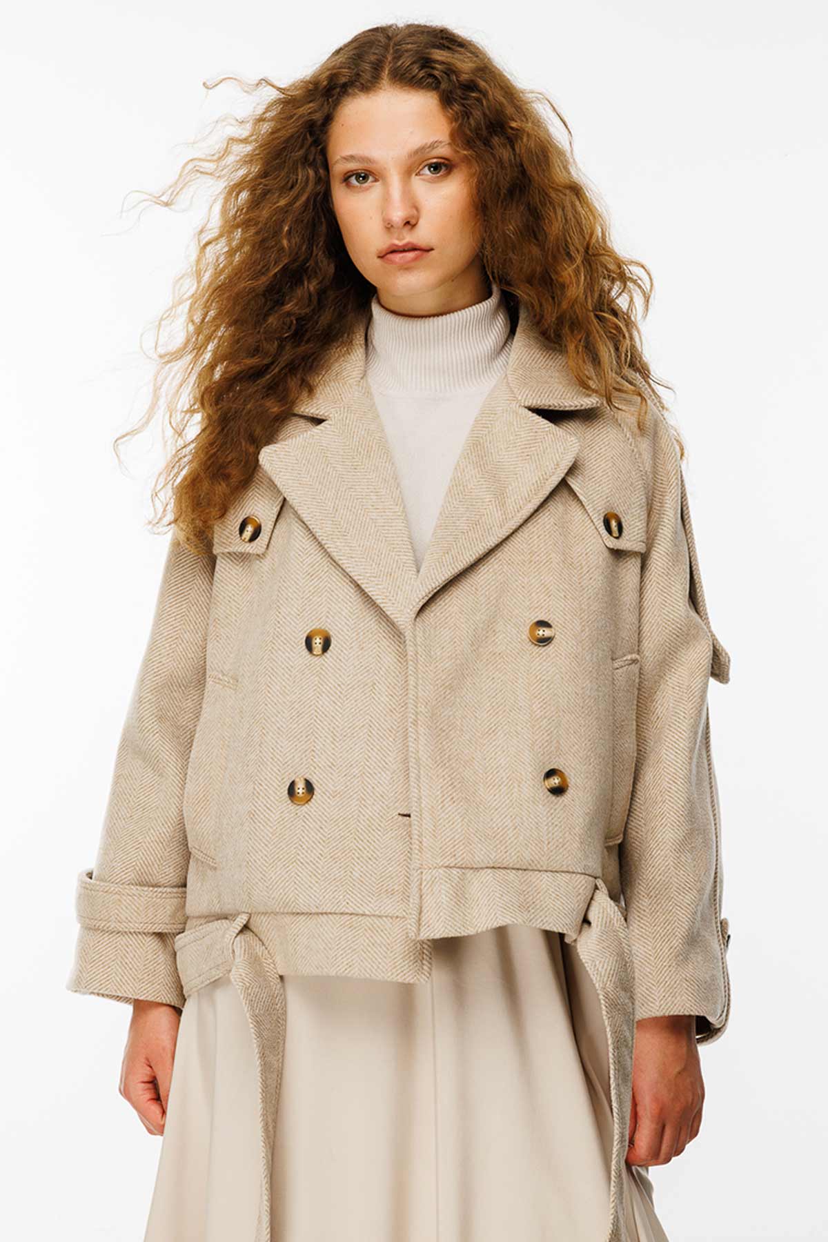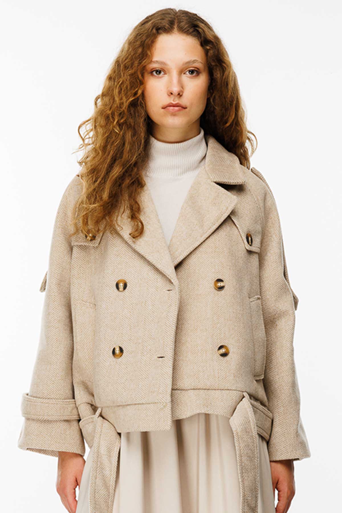 معطف إيزابيل قصير من الكشمير، يتميز بصدر مزدوج، وأكمام راجلان، وكتاف على الأكتاف والذراعين، وحاشية مربوطة بحزام، ومعطف قصير من الكشمير. 80% بيس 20% رايون تنظيف جاف فقط.