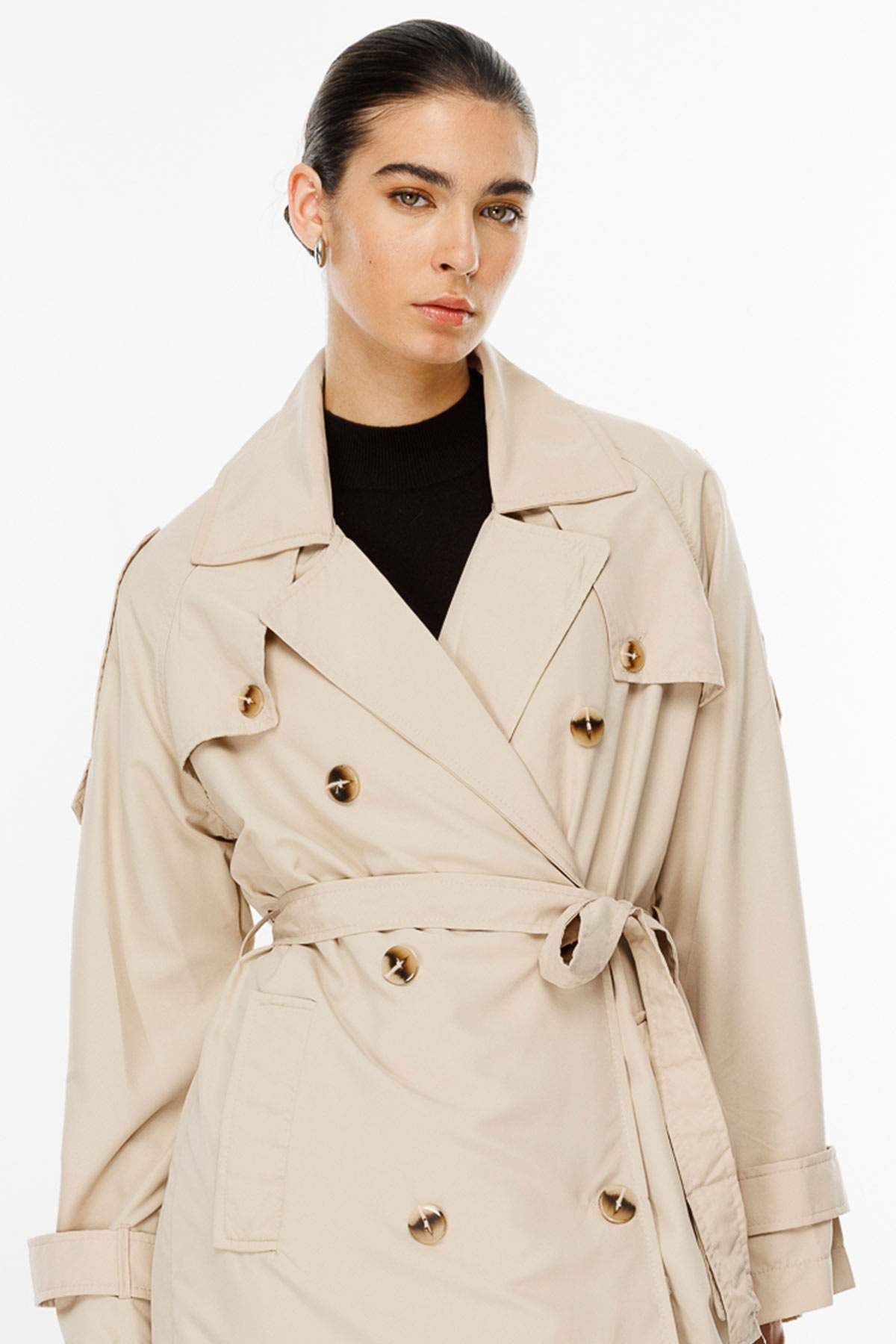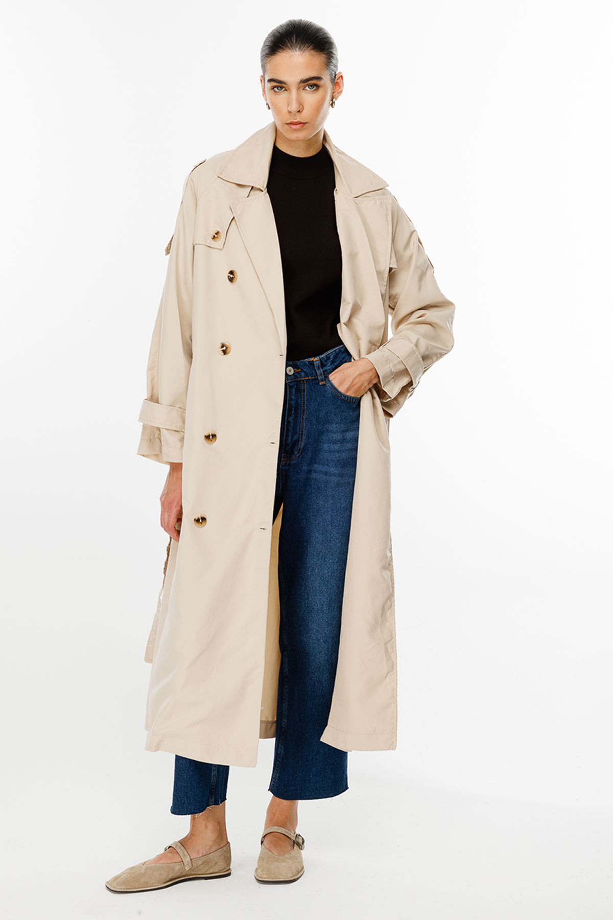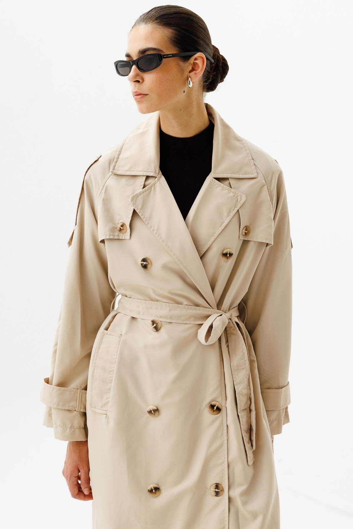 ميزات معطف المطر الناعم ذو الحجم الكبير: إغلاق بصدر مزدوج، وأكمام ريجلان، وتفاصيل من السترة الواقية من الرياح والكتاف، وقصة واسعة، وجيوب جانبية، وحزام من القماش نفسه، وفتحة خلفية، ومعطف واق من المطر غير مبطن بطول كبير، 100% من البولي إيثيلين.