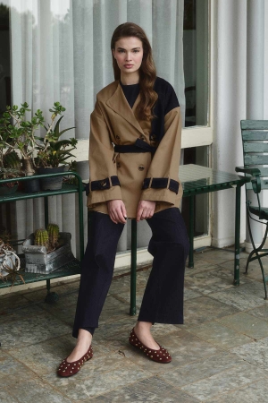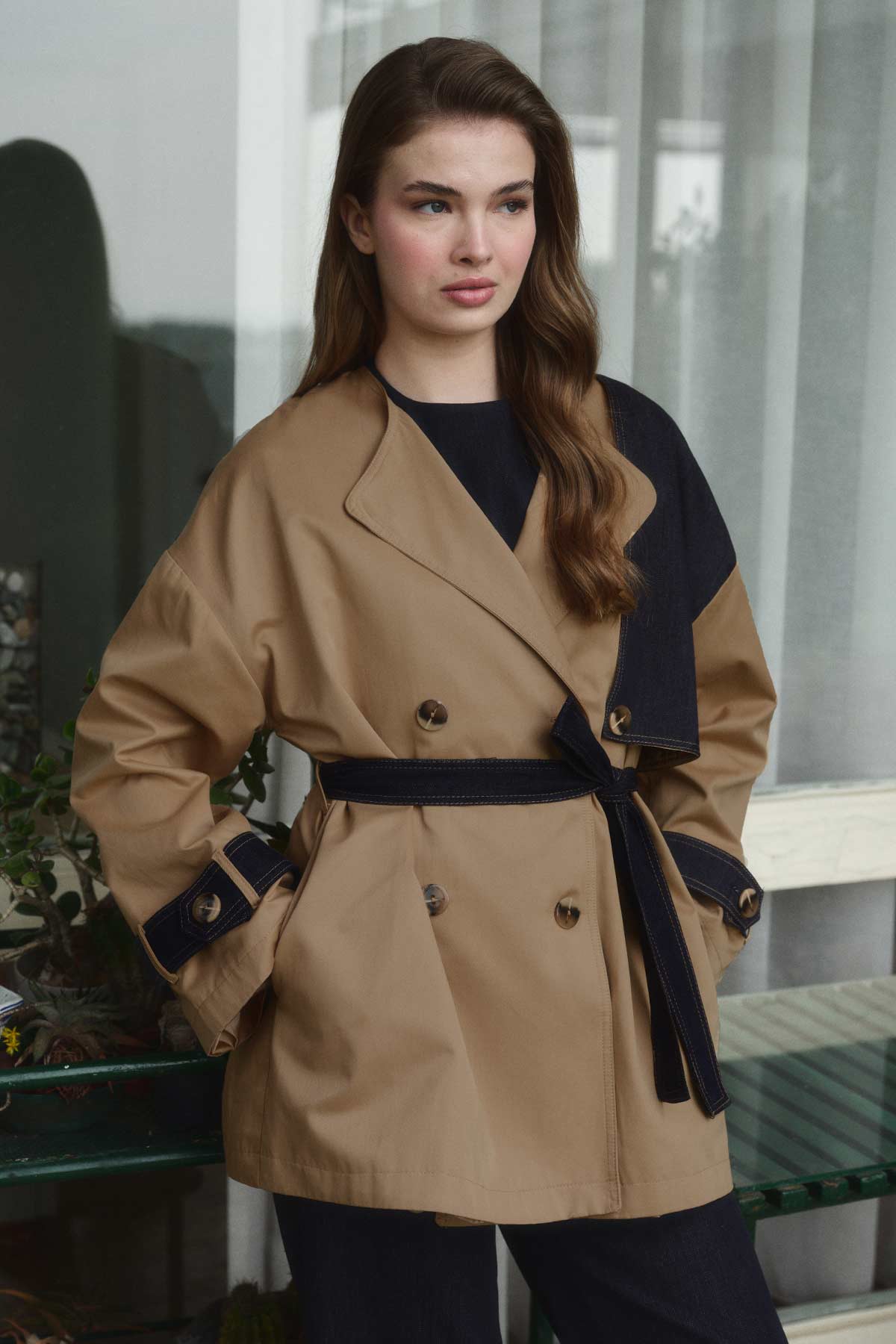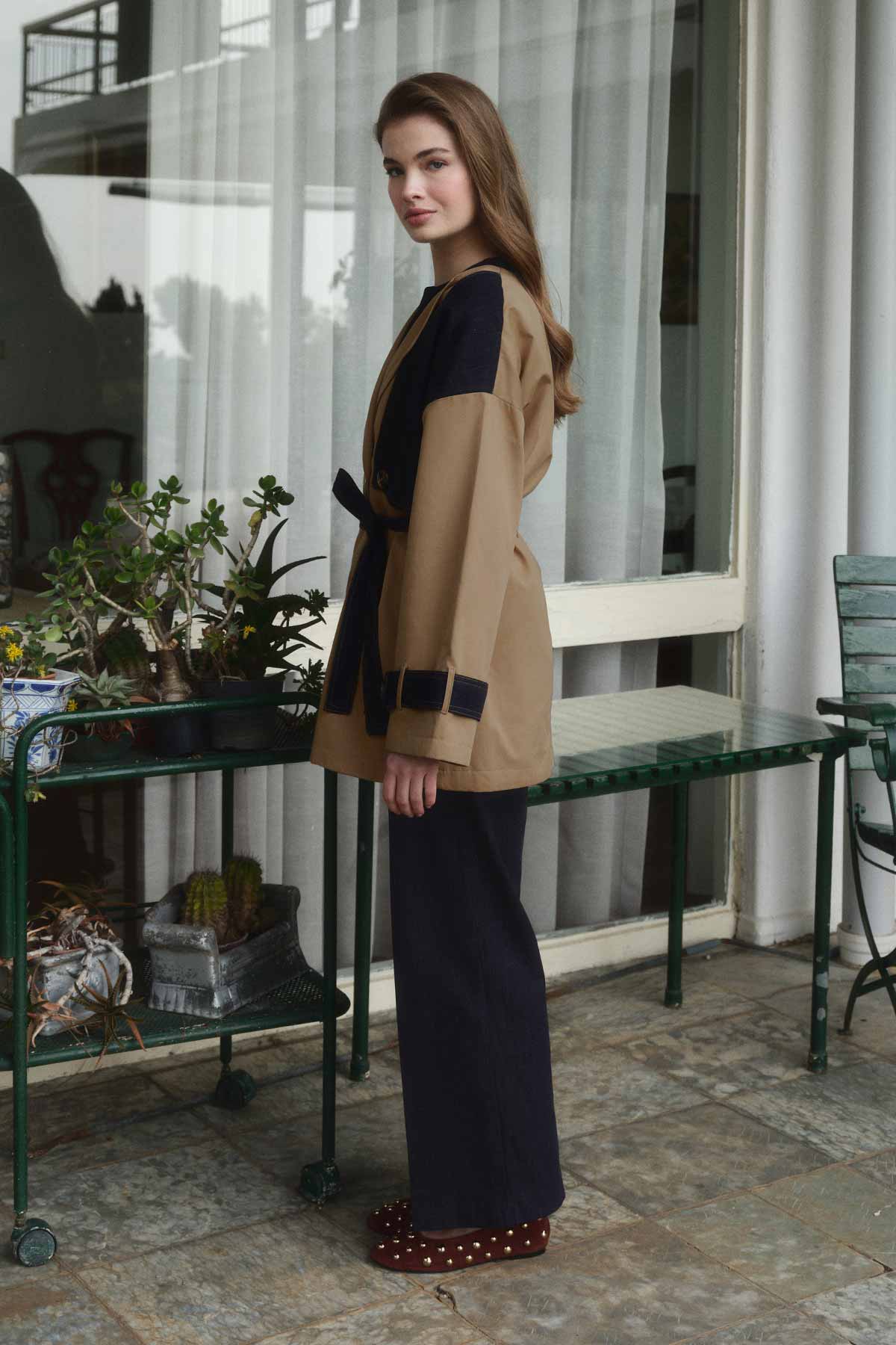 معطف واق من المطر بتفاصيل مزدوجة الصدر من الدنيم، يتميز بصدر مزدوج، وأزرار مزدوجة، وتفصيل جيب، وحزام من القماش نفسه، وحلقات للحزام، وتفصيل نصف من الدنيم، وتفصيل حزام على الأكمام، وأكتاف منسدلة، وقصة مريحة، ومعطف واق من المطر مبطن. محتوى القماش وتعليمات الغسيل: 60% قطن، 40% تنظيف جاف. يغسل بالماء البارد، لا تستخدم المجفف. مقاس المنتج: S-M قياسات الموديل: الارتفاع: 1.71 سم، الصدر: 78 سم، الخصر: 57 سم، الأرداف: 87 سم