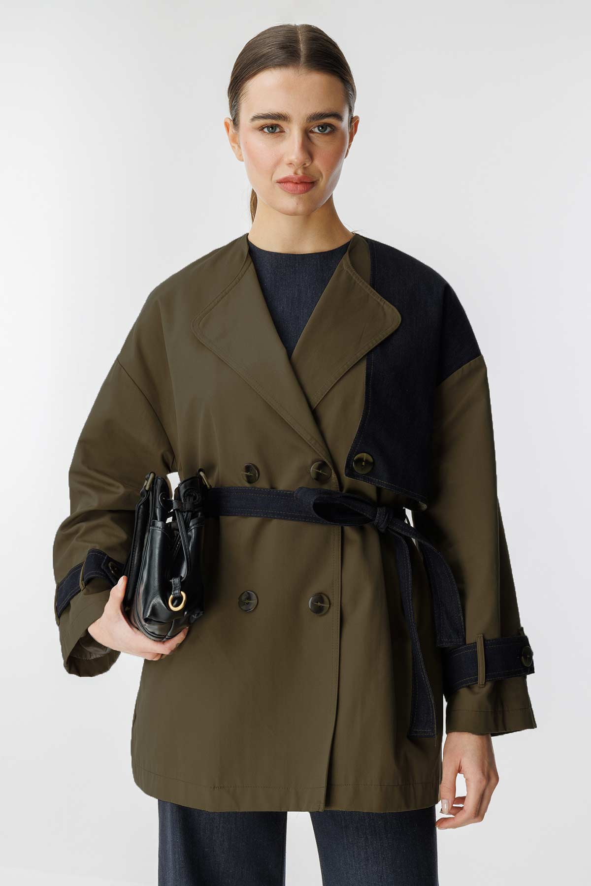 معطف واق من المطر كاكي مزدوج الصدر بتفاصيل من الدنيم، صدر مزدوج، أزرار مزدوجة، تفاصيل جيب، حزام من القماش نفسه، حلقات للحزام، تفاصيل نصف دنيم، تفاصيل حزام على الأكمام، أكتاف منسدلة، مقاس مريح، معطف واق من المطر مبطن. محتوى القماش وتعليمات الغسيل: 60% قطن، 40% تنظيف جاف. يغسل بالماء البارد، لا تستخدم المجفف. مقاس المنتج: S-M قياسات الموديل: الارتفاع: 1.72 سم، الصدر: 80 سم، الخصر: 60 سم، الأرداف: 90 سم