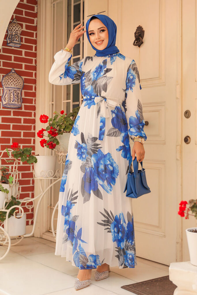فستان حجاب أزرق نيلي منقوش 34467ım