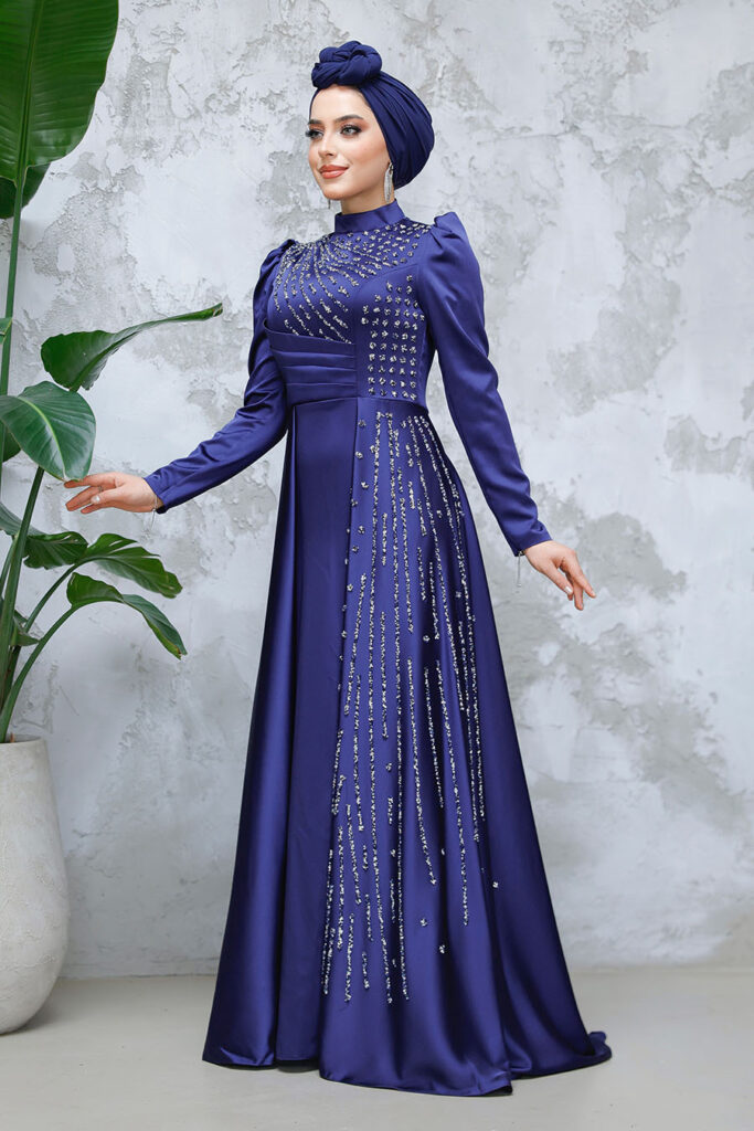 فستان سهرة حجاب – فستان سهرة حجاب أزرق نيلي مطرز 47631ım