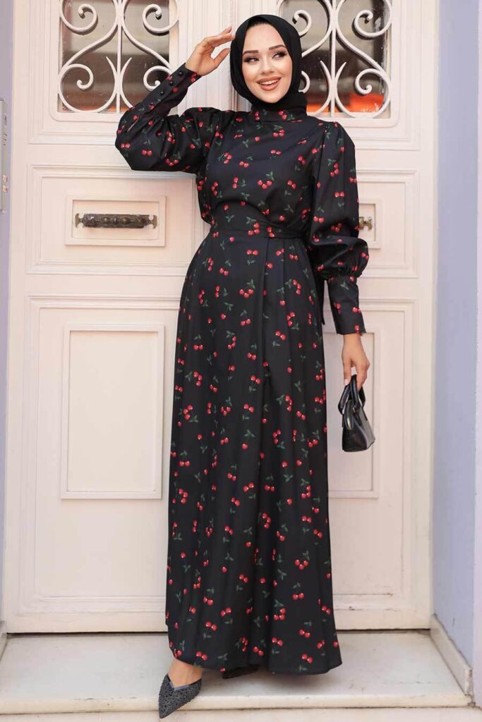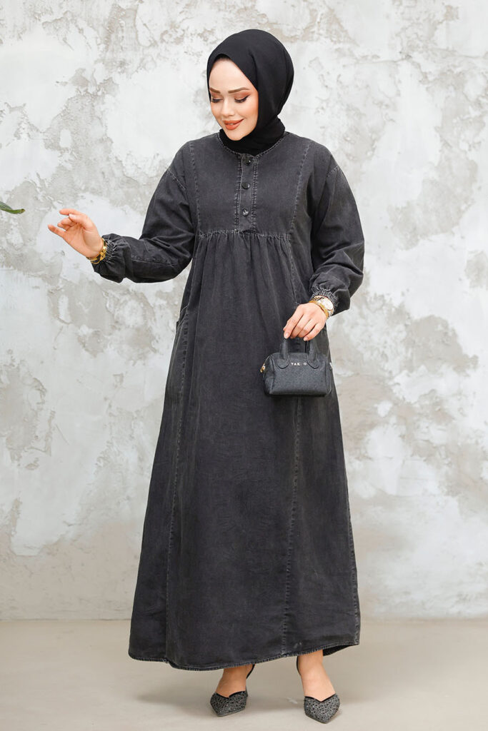فستان حجاب من الدنيم باللون الفحمي بأزرار 19139ant