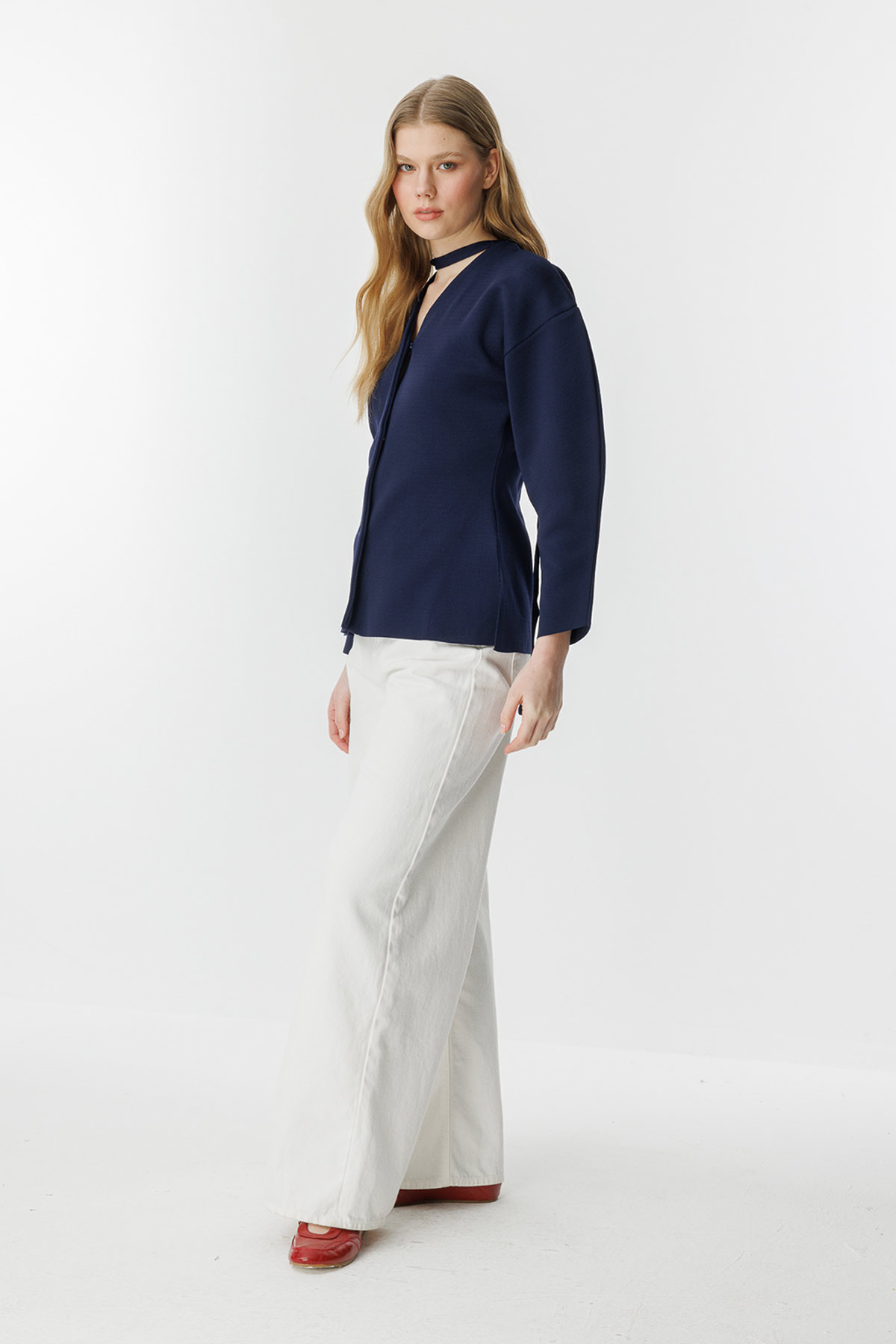 سترة ناي ملائمة عند الخصر، باللون الأزرق الداكن، وتتميز برقبة على شكل حرف V، وقفل أمامي ملون، مثبتة عند الخصر، وشقوق جانبية، وحزام متحرك من القماش الذاتي، وأكتاف منسدلة، وسترة صوفية مرسيرية كاملة المقاس. محتوى القماش وتعليمات الغسيل: 60% فيسكوز 40% بيس. يُغسل على دورة لطيفة في برنامج قصير. مقاس المنتج: S مقاسات الموديل: الارتفاع: 1.77 سم، الصدر: 81 سم، الخصر: 62 سم، الأرداف: 92 سم